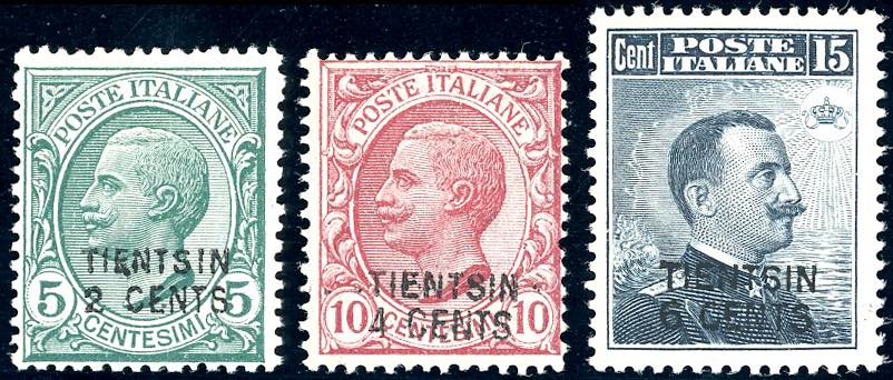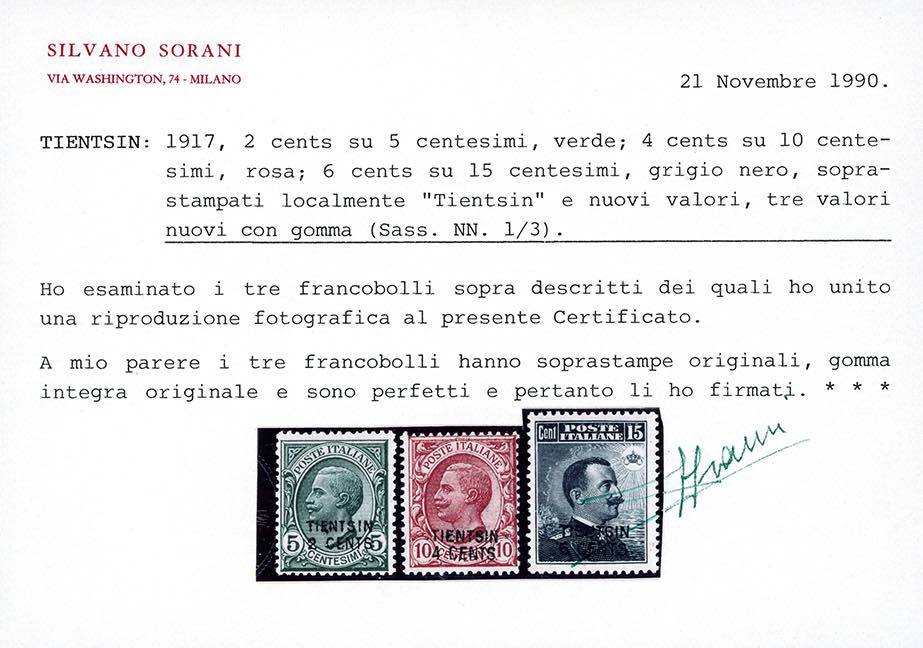 TIENTSIN 1917 - Soprastampa locale apposta a mano, serie completa (1/3), nuovi, gomma originale integra, perfetti. Molto belli. A.Diena, cert. Sorani.
