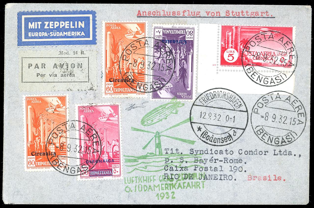 POSTA AEREA 1932 - 60 cent. due esemplari, 80 cent. soprastampati in azzurro, 50 cent. soprastampati in maiuscolo e sbarette, 5 lire soggetti Africani, angolo di foglio (A2,A3,A4,A11), perfetti, su aerogramma da Bengasi 8/9/1932 a Rio de Janeiro in Brasile, viaggiato con il dirigibile Zeppelin, 6°Sudamerikafahrt, come da cachet speciale apposto al recto. Molto bello e non comune. Cert. Ferrario.