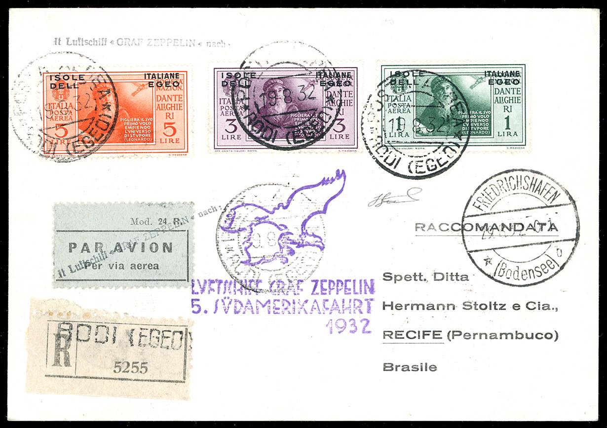 POSTA AEREA 1932 - 10, 20 coppia e 25 cent. Pittorica, dent. 11 al verso (4,5,6), in affrancatura mista con 1,3 e 5 lire Dante, posta aerea Emissioni Generali (A9,A10,A11), perfetti, su cartolina raccomandata via aerea da Rodi 19/8/1932 a Recife in Brasile, viaggiata via Graf Zeppelin, 5°Sudamerikafahrt, bolli speciali, di arrivo e di transito. Molto bella. Cert. Ferrario.