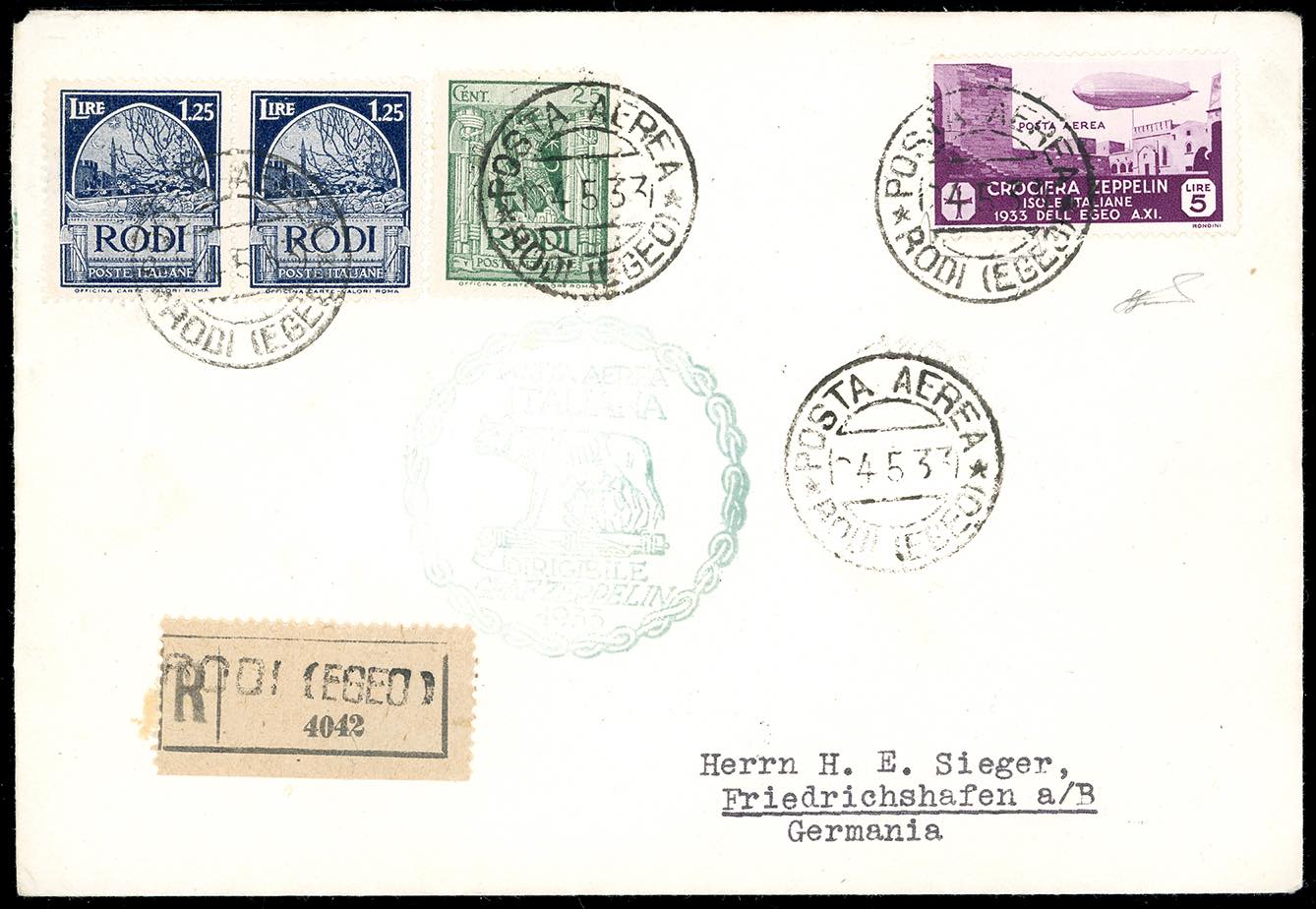 POSTA AEREA 1933 - 5 lire Zeppelin, con valori complementari (A23,59,62), perfetti, su aerogramma raccomandato da Rodi 24/5/1933 a Friedrichshafen in Germania, viaggiato con la Crociera Italiana del dirigibile Graf Zeppelin, come da cachet speciale apposto al recto e bolli speciali al verso. Bello. Ferrario.