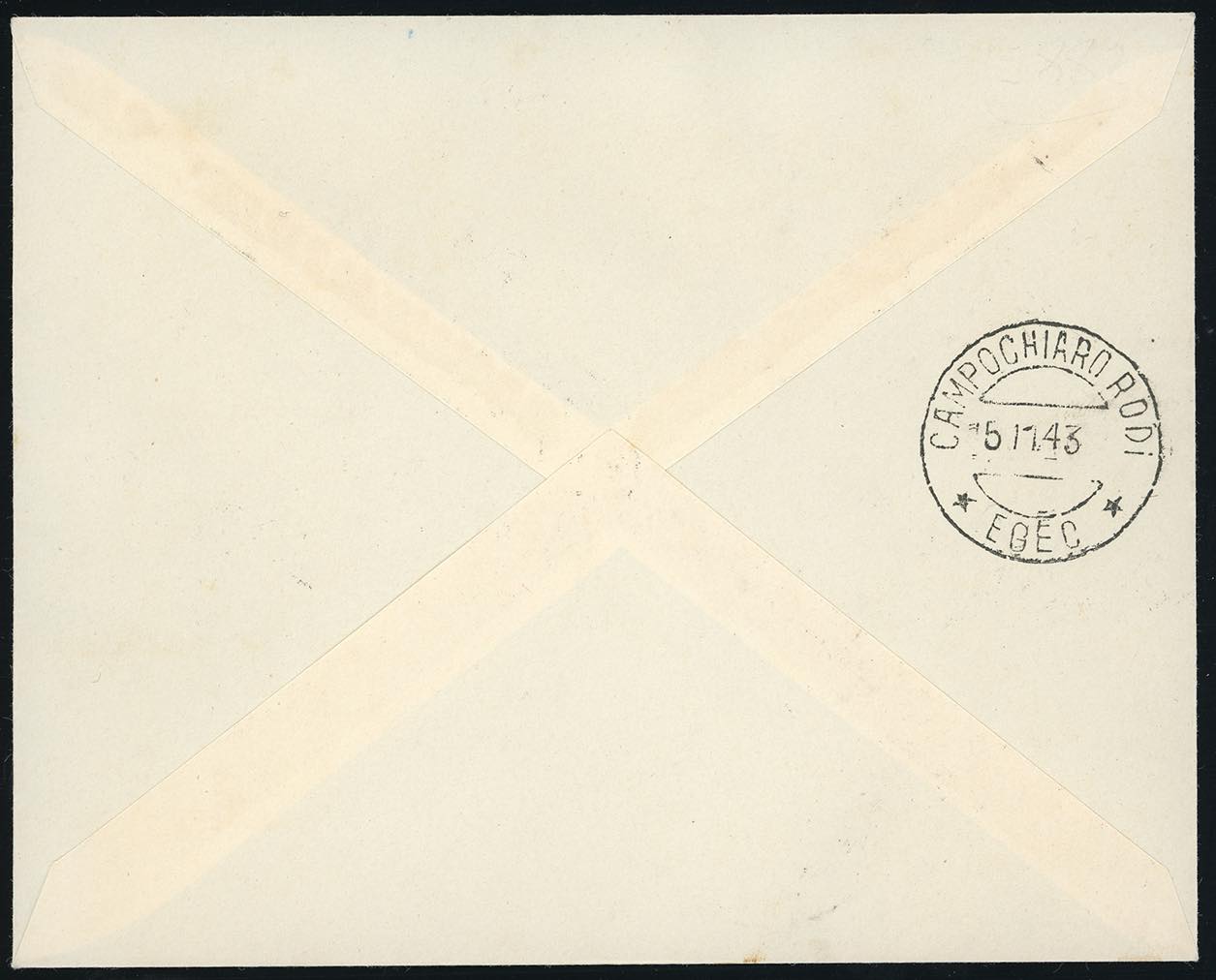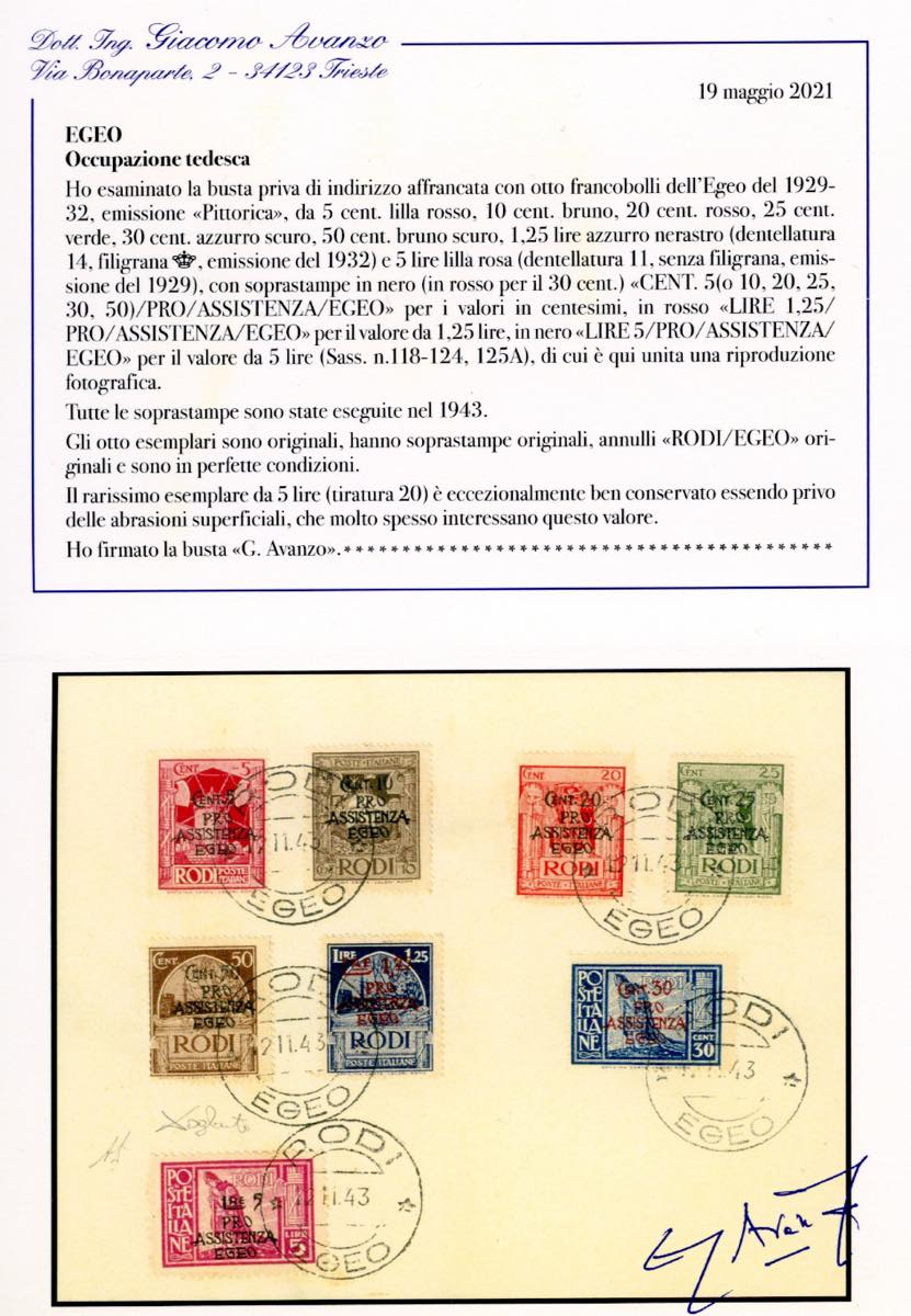 OCCUPAZIONE TEDESCA EGEO 1943 - 5 + 5 lire Pro Assistenza Egeo, dent. 11, senza filigrana, con sette valori complementari (125A,118/124), perfetti, usati su busta (non viaggiata), annullata a Rodi 12/11/1943. Il rarissimo esemplare da 5 lire (tiratura 20 esemplari) è eccezionalmente ben conservato e senza le consuete abrasioni superficiali. Rarità del settore, di splendida qualità. A.Diena, cert. Avanzo e Ferrario.