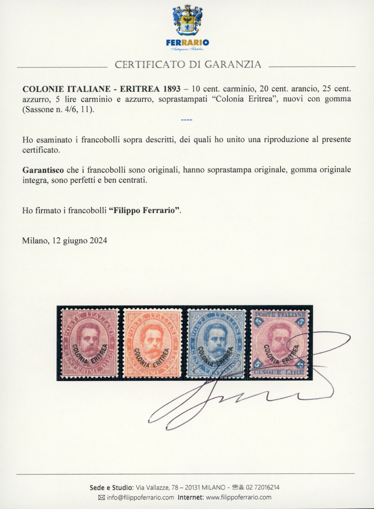 1893 - Prima emissione, soprastampati, serie completa (1/11), gomma originale integra, perfetti. Alti valori ben centrati. Ottima qualità. Cert. Ferrario per gli alti valori, cert. Cilio per il 25 cent.