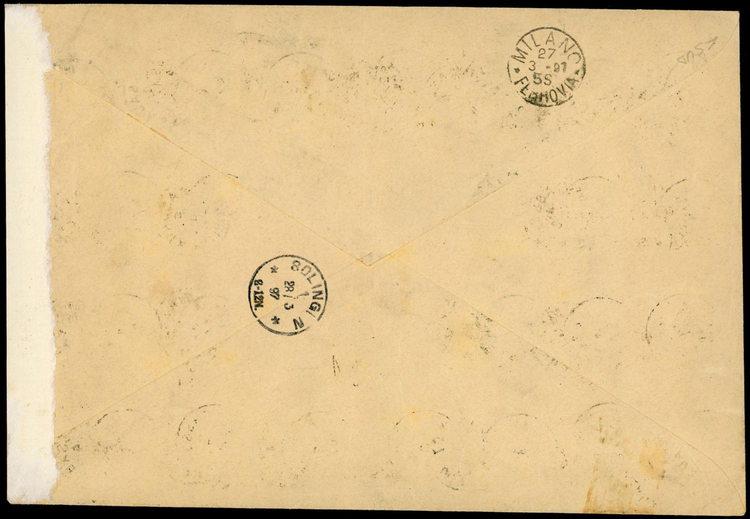 1897 - 1 lira, sette esemplari, 60 cent., dieci esemplari, 10 cent., sette esemplari, Umberto I (10,9,4), ottimo stato, su busta raccomandata da Massaua 4/3/1897 per la Germania. Eccezionale e spettacolare affrancatura multipla. Una delle lettere più importanti di Eritrea. Cert. Ferrario.