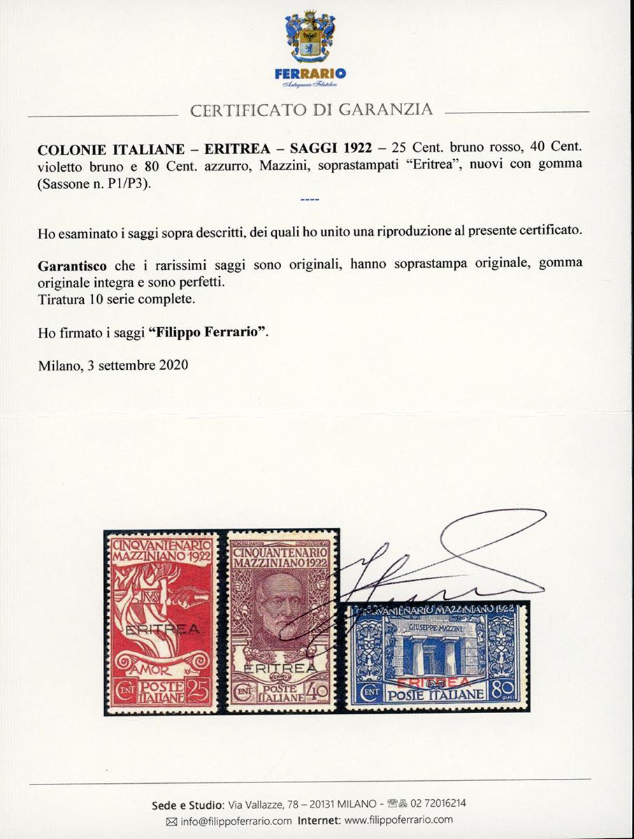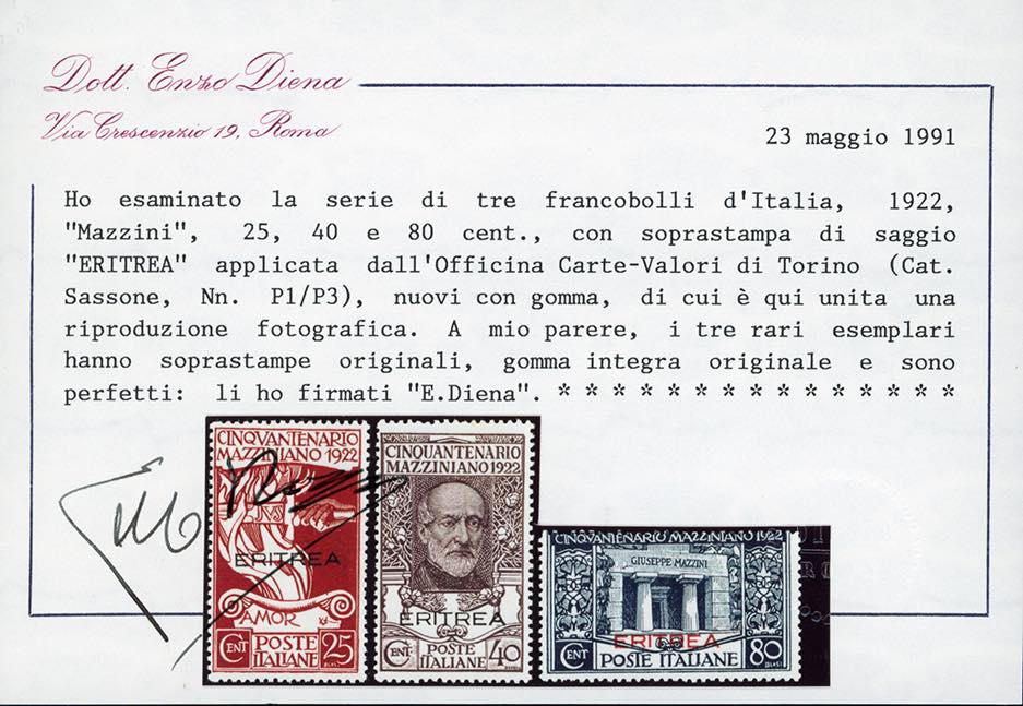 1922 - Mazzini soprastampati, saggi, serie completa (P1/P3), nuovi, gomma originale integra, perfetti e di ottima qualità. Estremamente rari, TIRATURA SOLO 10 SERIE. Cert. E.Diena e Ferrario.