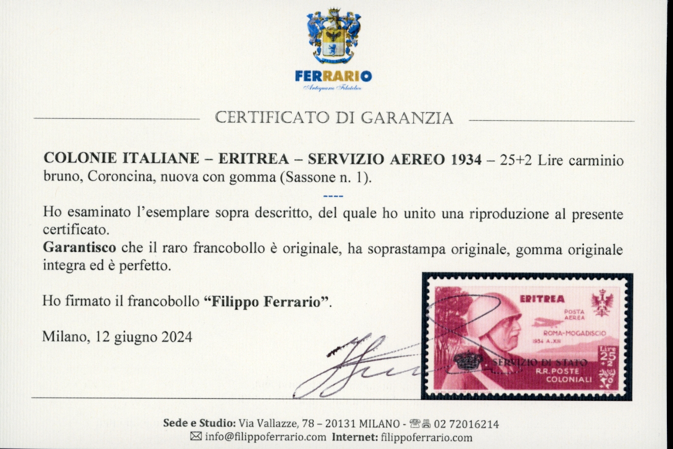 SERVIZIO AEREO 1934 - 25 + 2 lire Coroncina (1), gomma originale integra, perfetto e di ottima qualità. G.Oliva, fotocopia cert. Oro Raybaudi, cert. Ferrario.