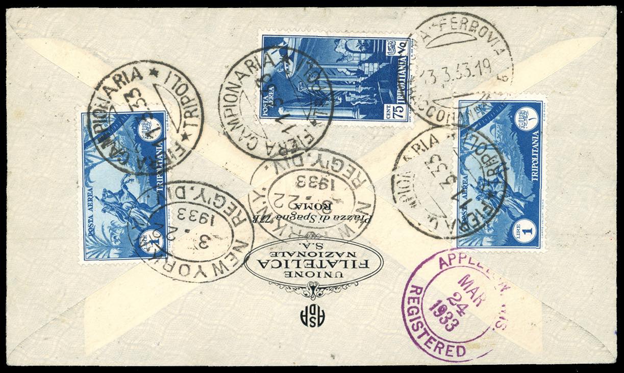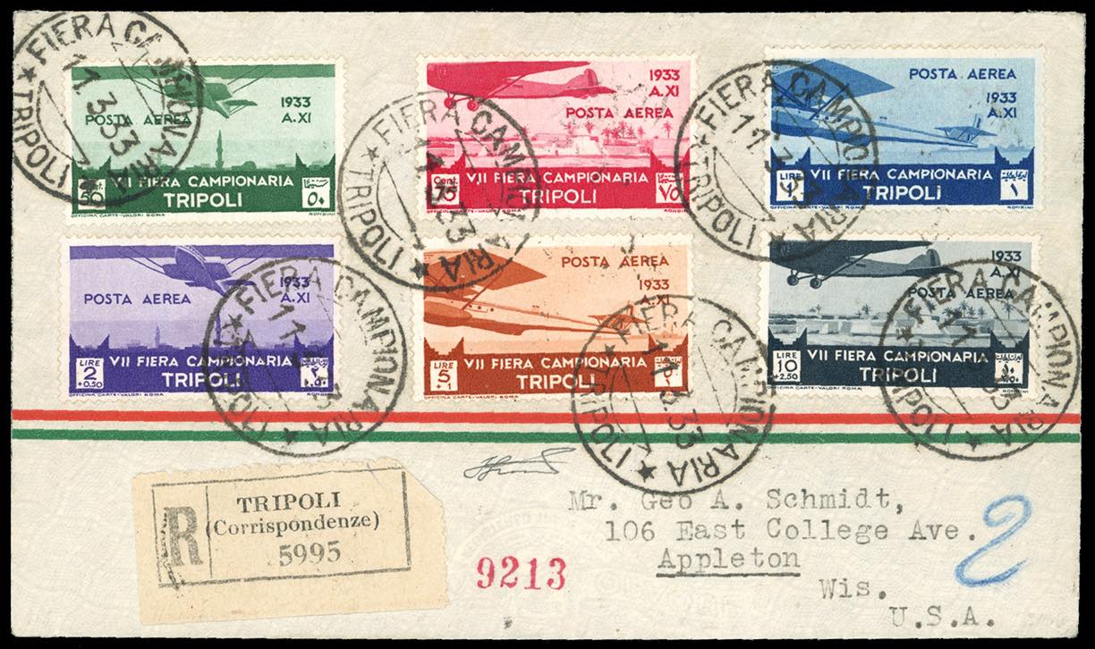 POSTA AEREA 1933 - VII Fiera di Tripoli, serie completa di posta aerea (8/13), con complementari al verso, su aerogramma raccomandato da ... Leggi tutto
