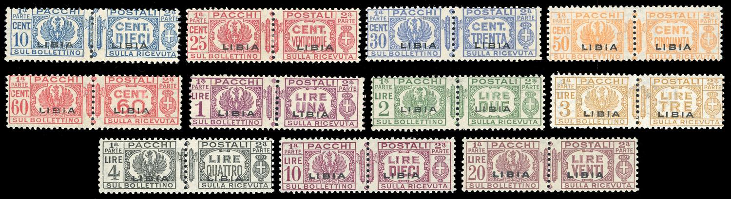 PACCHI POSTALI 1927/37 - Fascio al centro soprastampati, serie completa (14/24), gomma originale integra, i primi due bassi valori con leggera traccia di linguella, perfetti. Molto freschi. A.Diena per il 10 lire, cert. Ferrario per il 10 e 20 lire.