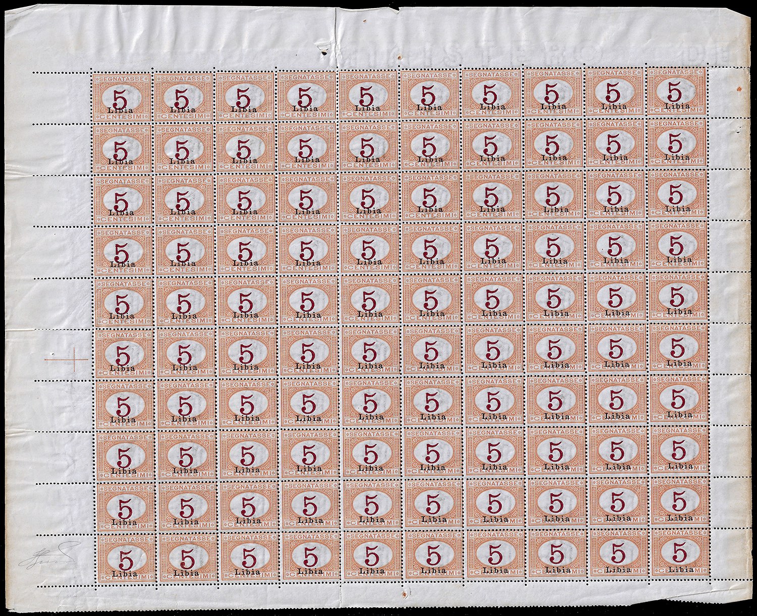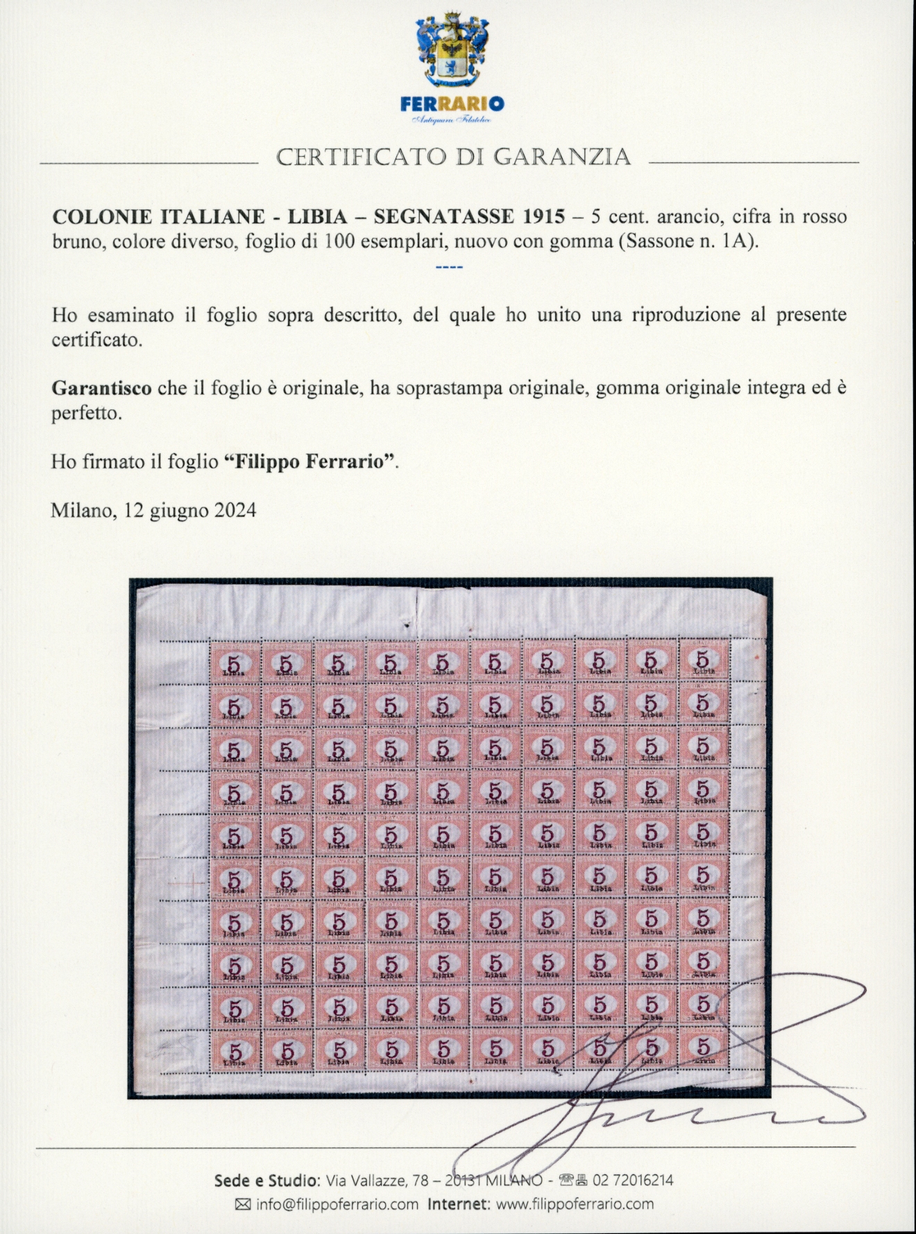SEGNATASSE 1915 - 5 cent. arancio, CIFRA IN ROSSO BRUNO, colore diverso (1A), foglio di 100 esemplari, nuovo, gomma originale integra, perfetto. Molto bello ed estremamente raro. Cert. Ferrario.