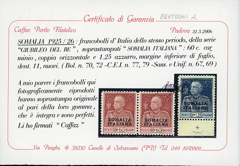 1925/26 - 60 cent., coppia, e 1,25 lire Giubileo, dent. 11 (67,69), ottima centratura, il secondo bordo di foglio, gomma originale integra, perfetti e di ottima qualità. Cert. Caffaz.