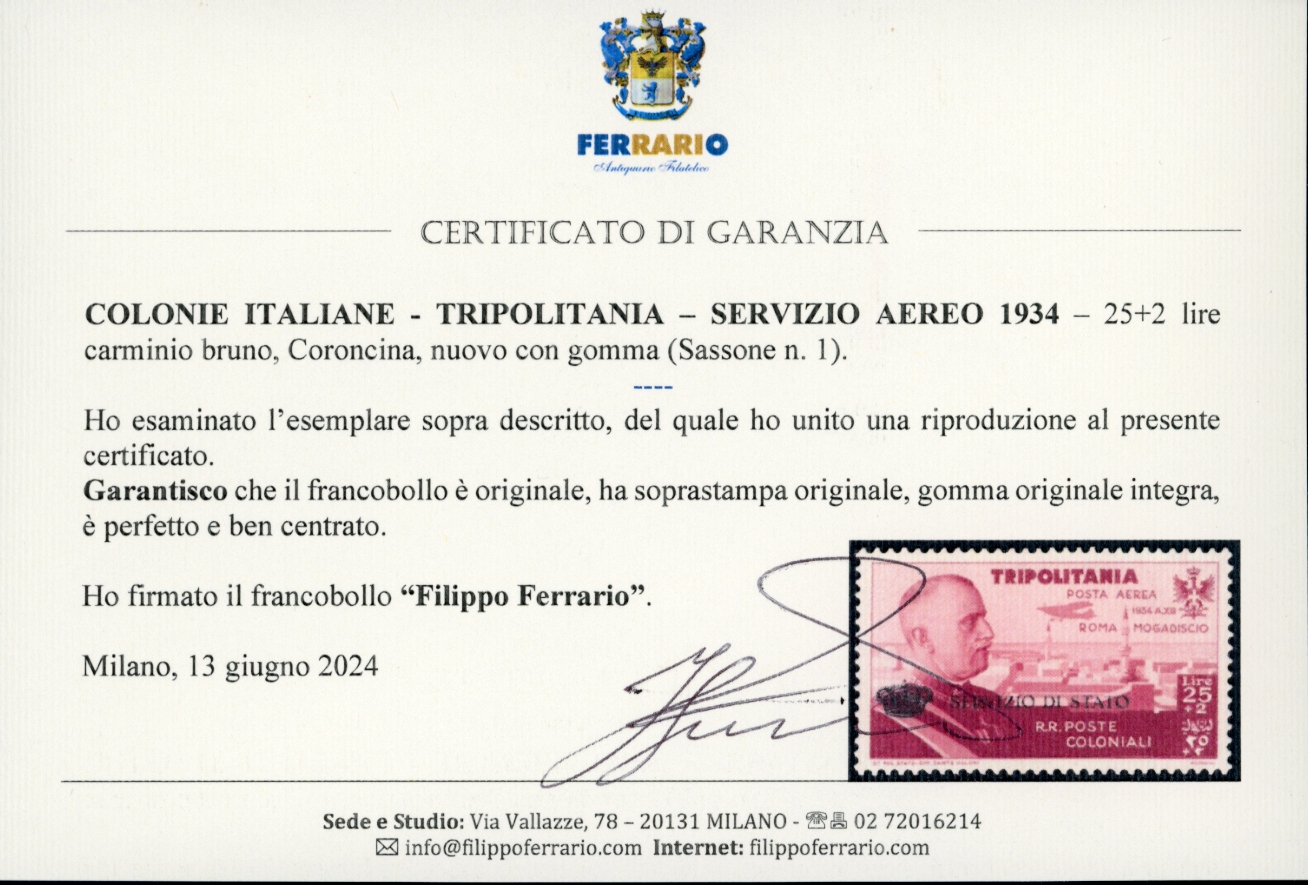 SERVIZIO AEREO 1934 - 25 + 2 lire Coroncina (1), nuovo, gomma originale integra, perfetto, ottima qualità. Oliva, fotocopia cert. Raybaudi, cert. Ferrario.
