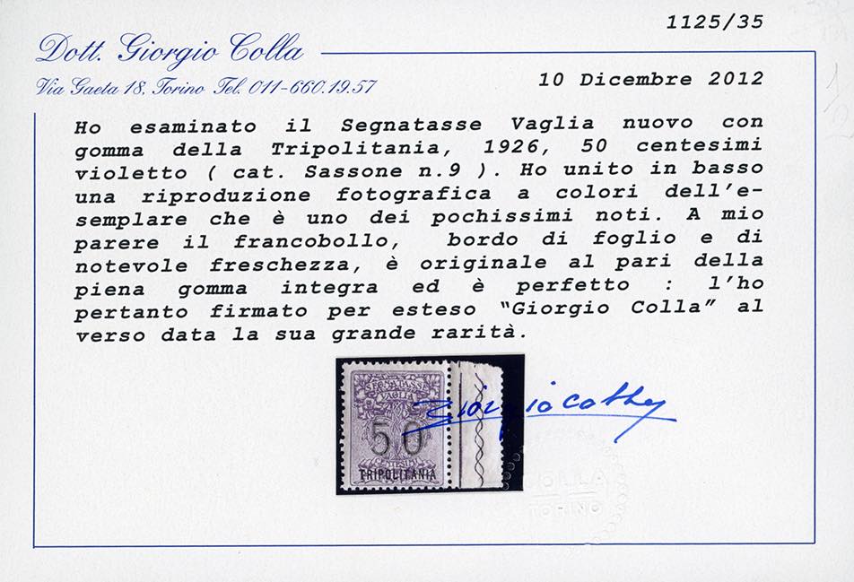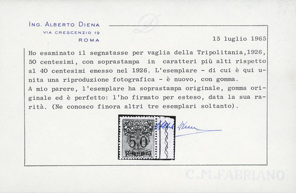 SEGNATASSE VAGLIA 1926 - 50 cent. violetto, SOPRASTAMPA IN CARATTERI PIU' GRANDI, non emesso (9), bordo di foglio a destra nuovo, gomma originale integra, perfetto. Splendido e freschissimo. Probabilmente il migliore esemplare di questo rarissimo francobollo, di cui si conoscono finora solo 6 esemplari. Cert. A.Diena, Colla.