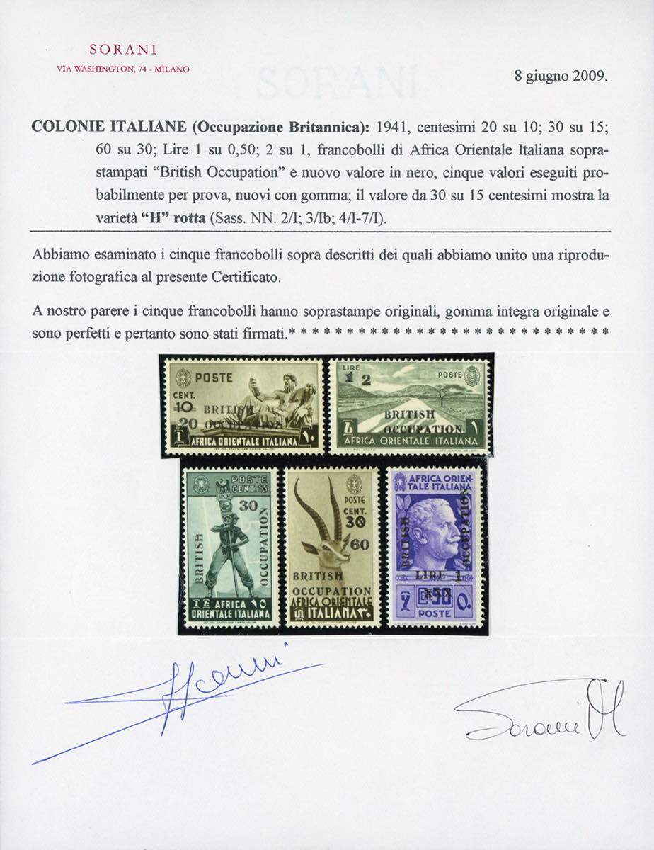 OCCUPAZIONE BRITANNICA AFRICA ORIENTALE 1941 - Soprastampata grigio nera, non emessi, serie completa (2/I-7/I), gomma originale integra, perfetti. Molto belli. Cert. Oro Raybaudi, Sorani e Ferrario.
