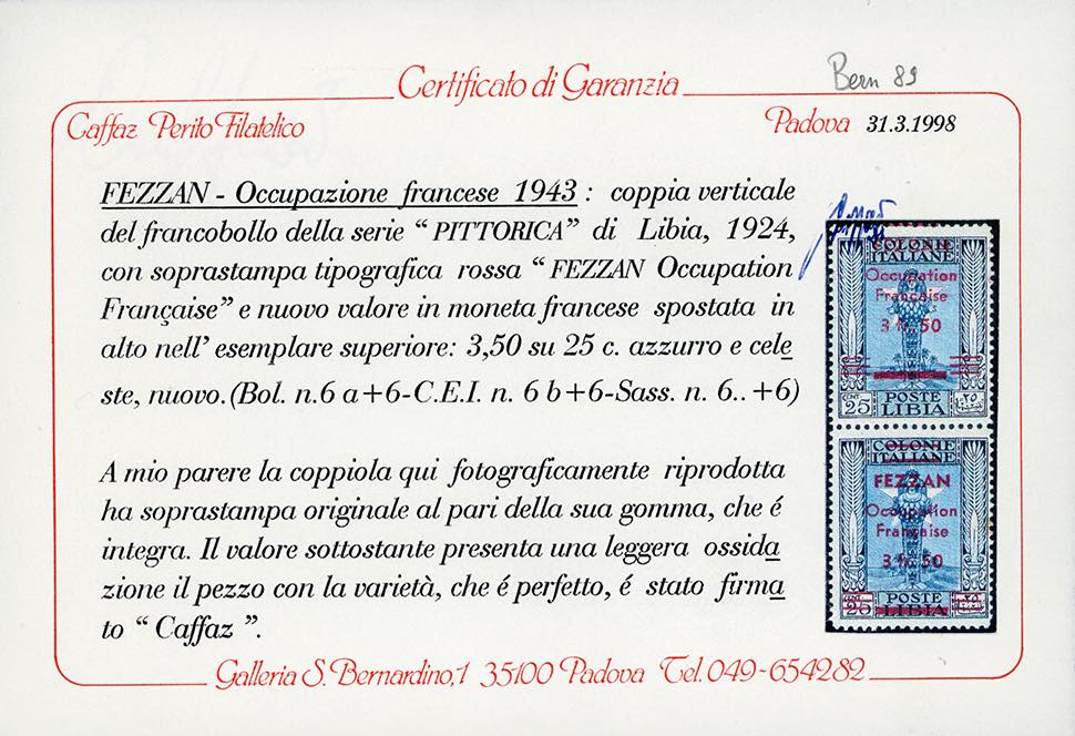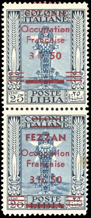 OCCUPAZIONE FRANCESE FEZZAN 1943 - 3,50 fr. su 25 cent., soprastampa fortemente spostata in alto, senza la dicitura "Fezzan", in coppia con il normale (6da,nota), nuova, gomma originale integra. L'esemplare con la varietà perfetto, quello normale con ossidazioni. Cert. Caffaz.