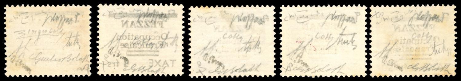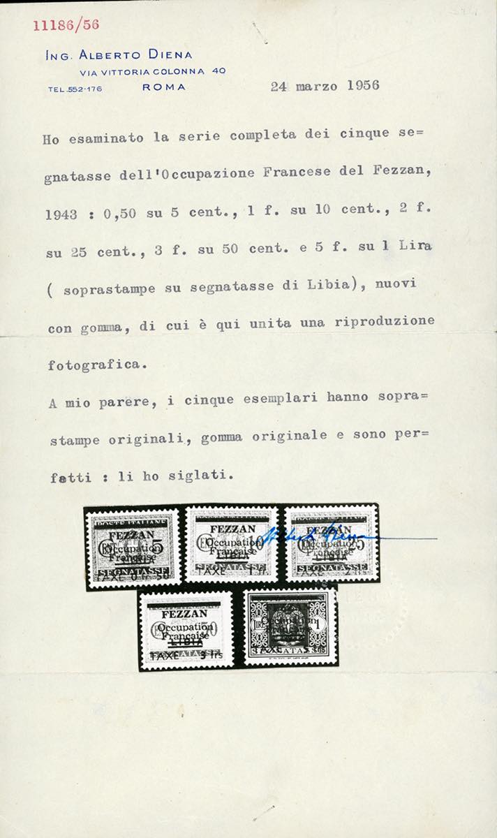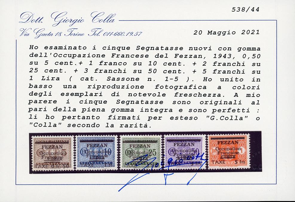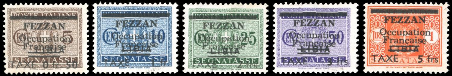 OCCUPAZIONE FRANCESE FEZZAN SEGNATASSE 1943 - Serie completa soprastampati (1/5), nuovi, gomma originale integra, perfetti. Splendidi e molto rari. G.Bolaffi, Caffaz, Raybaudi, cert. A.Diena e Colla.