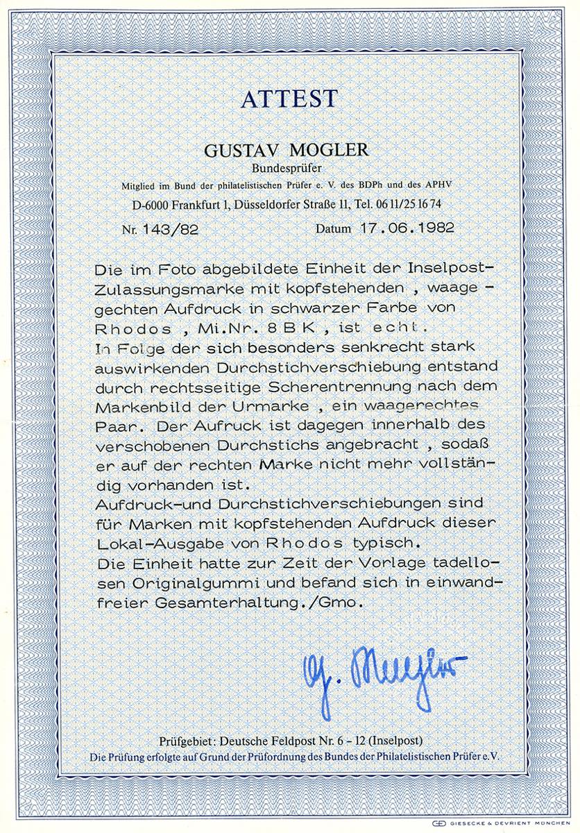 OCCUPAZIONE TEDESCA EGEO 1944 - Inselpost azzurro, emissione di Rodi, soprastampa capovolta e fortemente spostata a sinistra e perforazione fortemente spostata (2aa), coppia orizzontale, bordo di foglio, gomma integra, perfetta. Rara. Cert. Mogler.