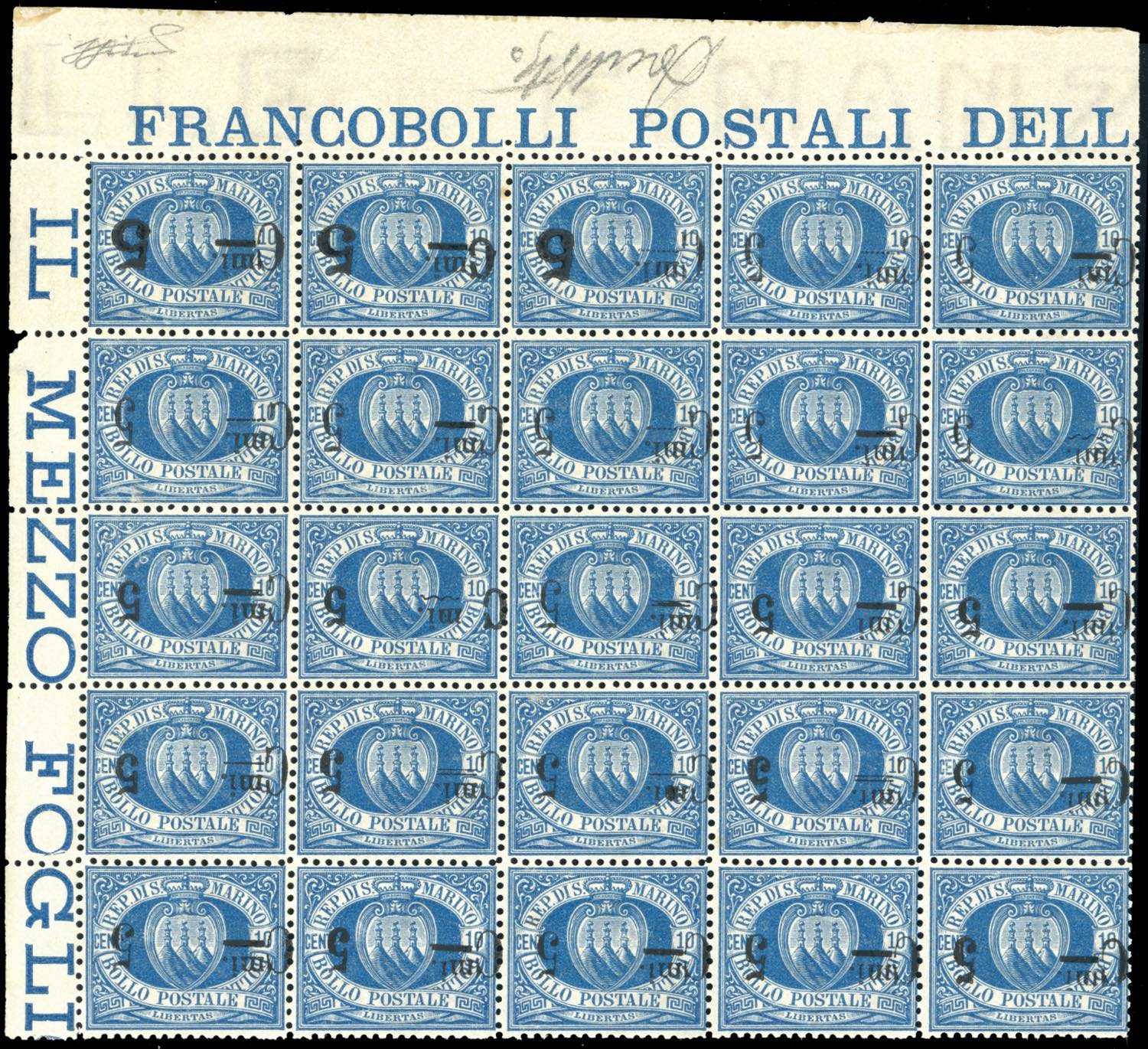 1892 - 5 cent. su 10 cent. azzurro, blocco di 25 esemplari angolo di foglio, soprastampa capovolta, comprendente anche diverse varietà di ... Leggi tutto