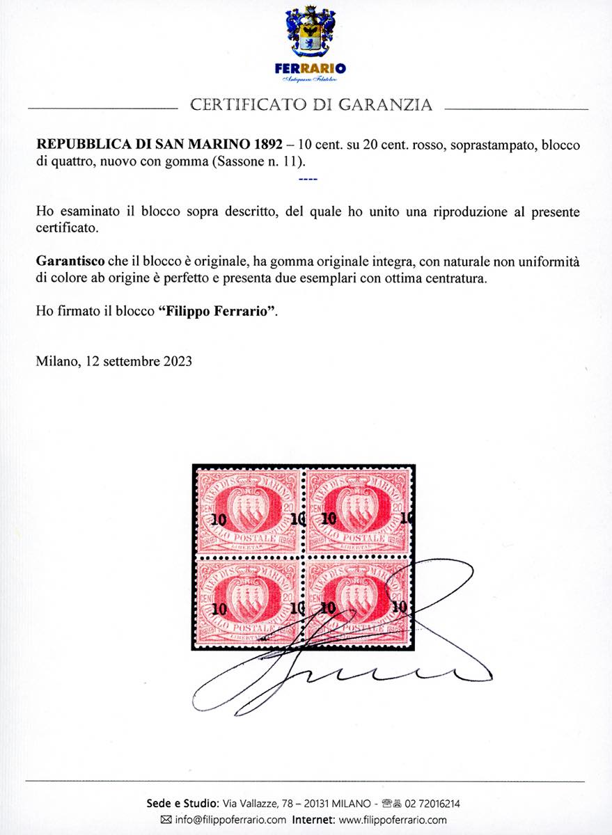 1892 - 10 cent. su 20 cent. (11), blocco di quattro, un esemplare con errore tipografico "cifre 10 ravvicinate", ottima centratura per due esemplari, gomma originale integra, con naturale non uniformità di colore ab origine, perfetto. Raro e di ottima qualità. Cert. Ferrario.