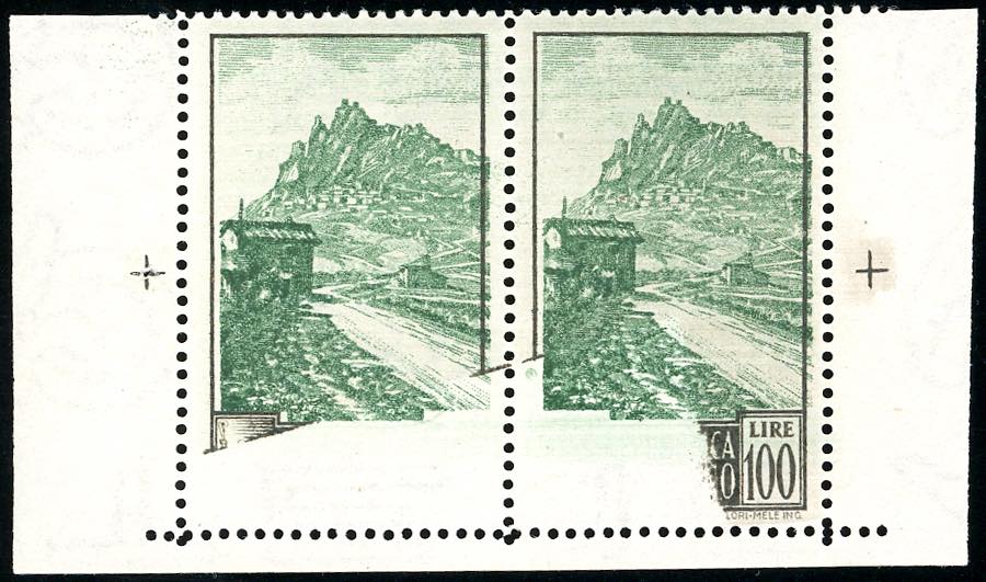 1949 - 100 lire Paesaggi (354), coppia orizzontale con entrambi gli esemplari con la stampa del tassello inferiore fortemente incompleta, ... Leggi tutto