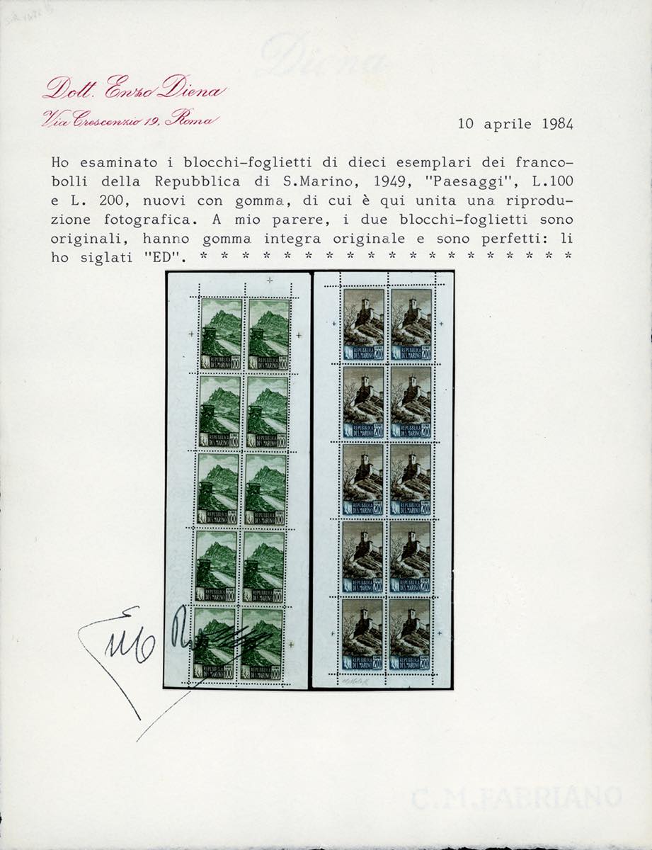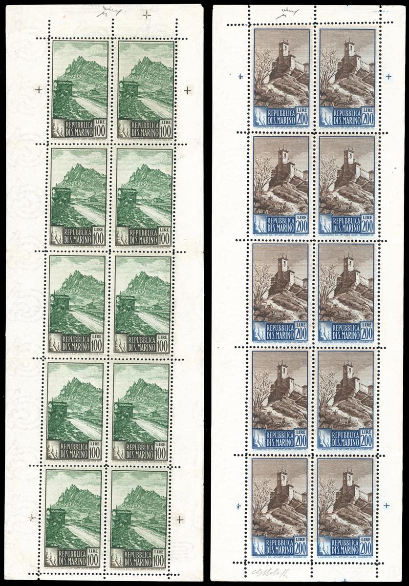 1949 - 100 e 200 lire Paesaggi, minifogli di dieci esemplari (10/11), lieve piega in corrispondenza della dentellatura, gomma originale integra, perfetti. Freschissimi e rari. Chiavarello, cert. Enzo Diena.