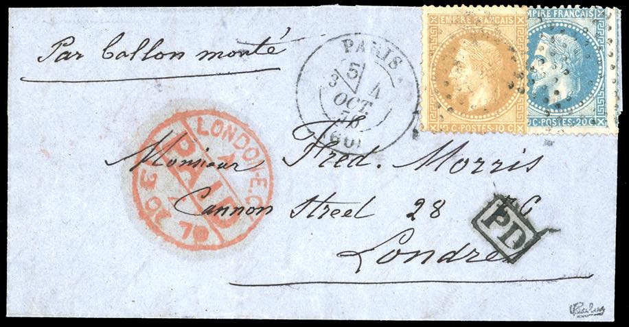 FRANCIA POSTA AEREA 1870 - 10 cent. e 20 cent. Napoleone laureato dentellati, su Ballon Montè da Parigi 4/10/1870 a Londra, trasportato con il pallone "L'Armand Barbès", bollo di arrivo sul fronte. Calves.