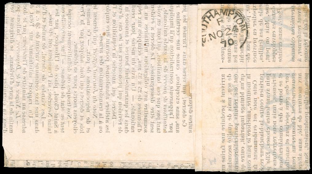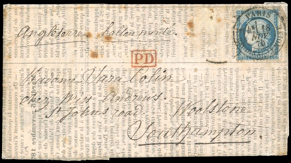 FRANCIA POSTA AEREA 1870 - 20 cent. Cerere dentellato su giornale "Ballon Poste" da Parigi 18/11/1879 a Southampton, in Gran Bretagna, bollo di arrivo al verso, trasportato con il Ballon Montè "General Uhrich". Raro.