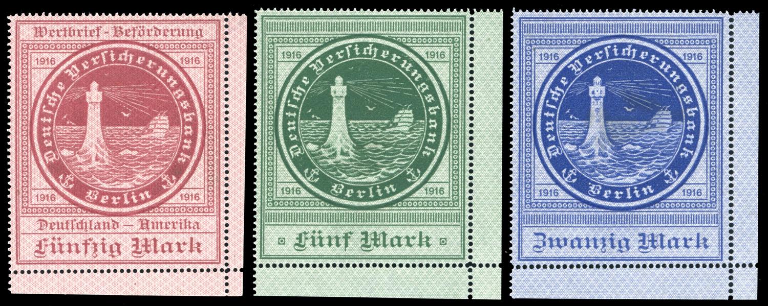 GERMANIA ASSICURATIVI SOMMERGIBILI 1916 - 50, 5 e 20 marchi (Michel 8,9,12), angolo di foglio, gomma originale integra, perfetti, lieve ... Leggi tutto