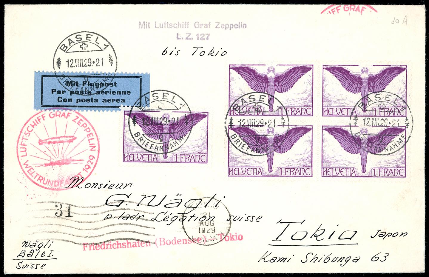 SVIZZERA POSTA AEREA 1929 - Aerogramma affrancato da Basilea 12/8/1929 trasportato con la crociera Zeppelin Friedrichshafen-Tokio, bolli speciali e bolli d'arrivo.