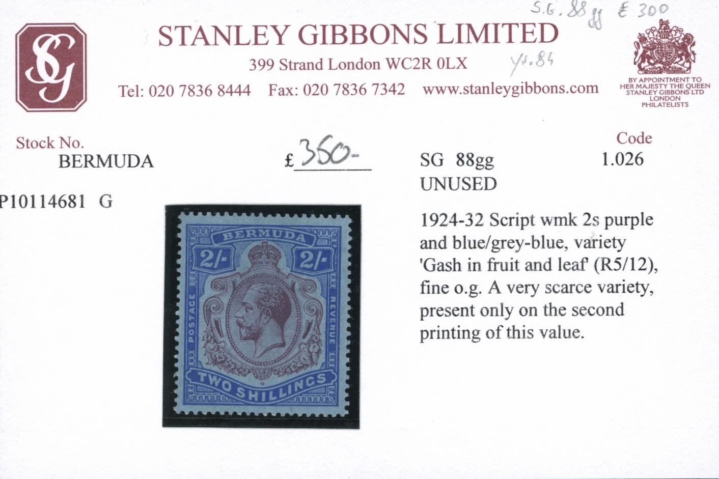 BRITISH COLONIES-BERMUDA 1924/32 - 2 s. purple and blu/grey blu Giorgio V, varietà "Gash in fruit and leaf" (SG.88gg), gomma originale, leggera traccia di linguella MLH, perfetto e molto fresco. Pregevole varietà, presente solo nella seconda tiratura.
