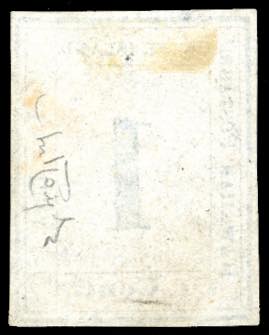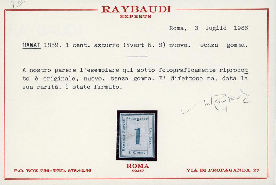HAWAI 1859 - 1 cent. azzurro, Missionari delle Hawai, tavola 2-A, VIII tipo, Westerberg pos.4 (Yv.8), nuovo, senza gomma. Presenta un puntino di inchiostro sotto "IS" di Island, una lievissima grinza sulla cifra 1 e lievissima traccia di inchiostro arancione sulla destra, visibili solo alla luce ultravioletta. Molto raro. Cert. Raybaudi.