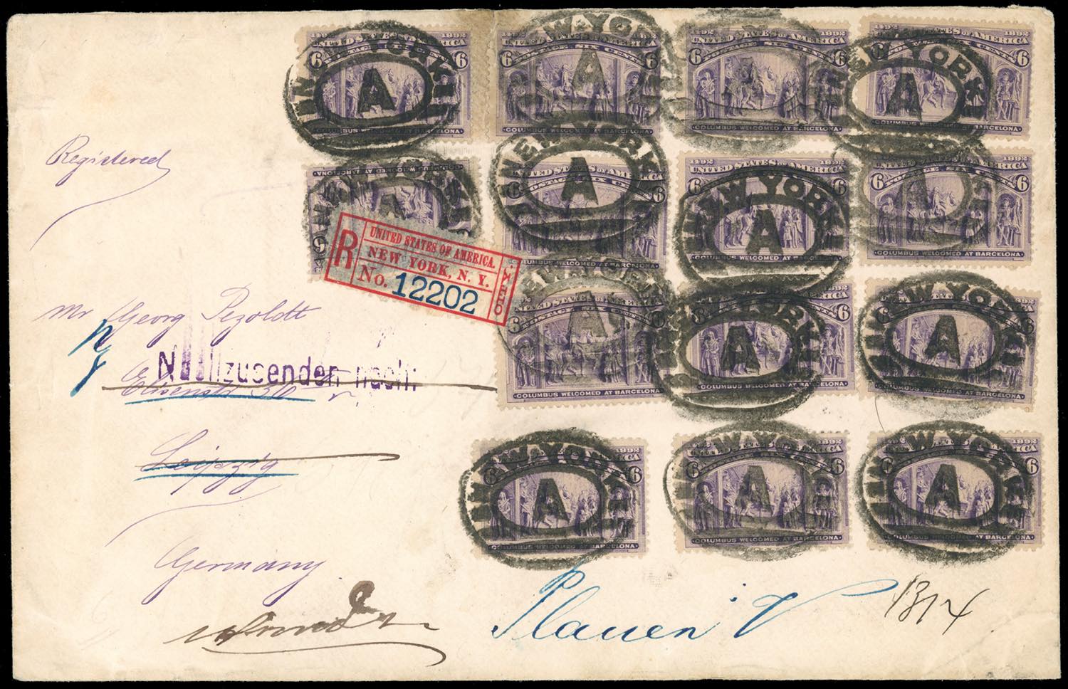 STATI UNITI 1893 - 6 cent. Colombo (Yv.86), quattordici esemplari, su busta raccomandata da New York 8/2/1893 per la Germania, rispedita. Rara affrancatura monovalore.