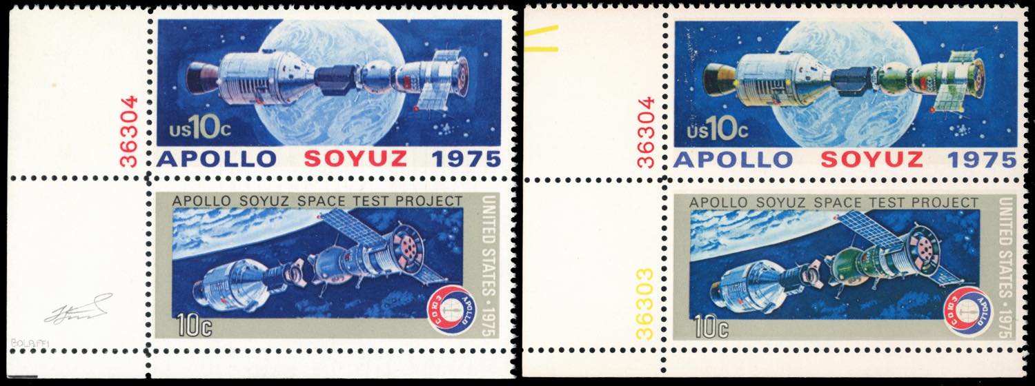 STATI UNITI SPAZIO 1975 - 10 + 10 cent. "Apollo-Soyuz azzurro", senza la stampa del giallo (Scott. 1570d), angolo di foglio, in cui è evidente la completa mancanza del numeretto in giallo, gomma originale integra, MNH, perfetta. Rarissima, solo 12 coppie note. Allegato esemplare normale per confronto.