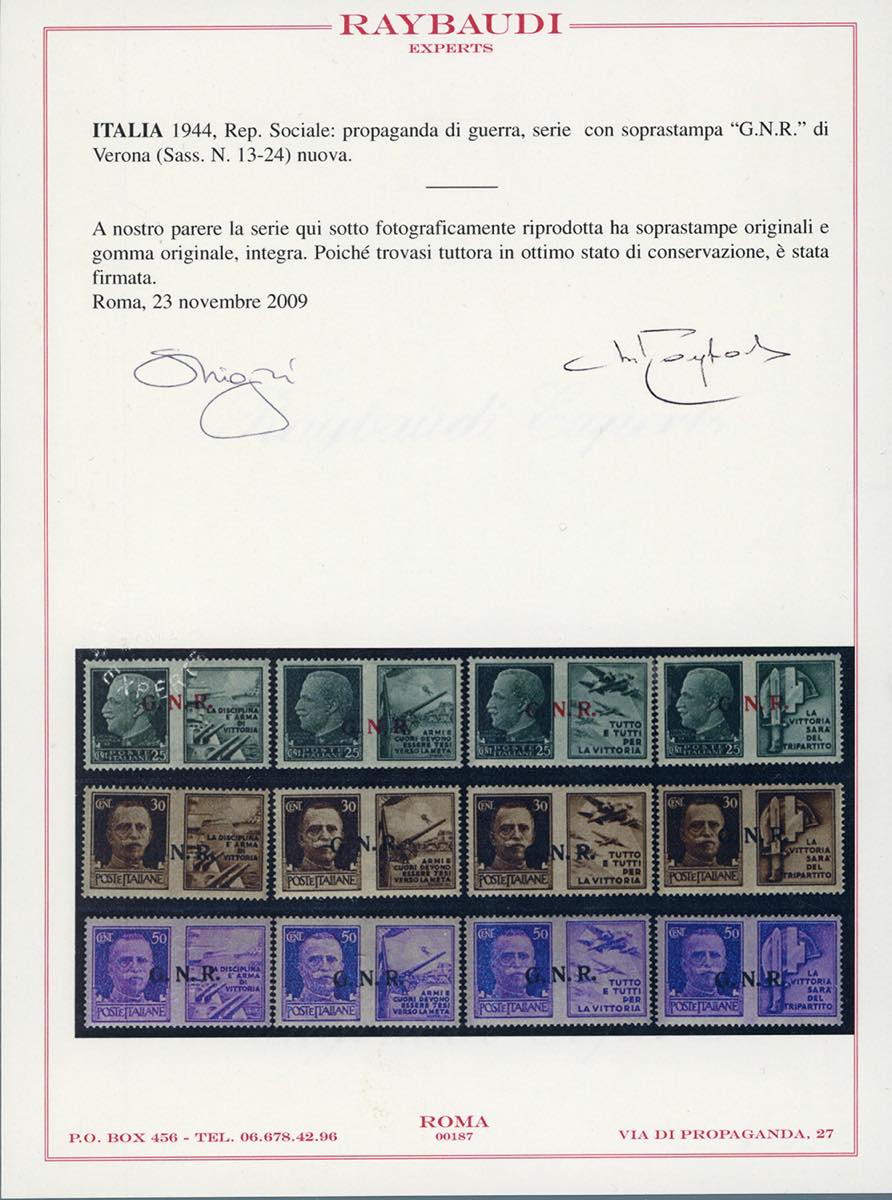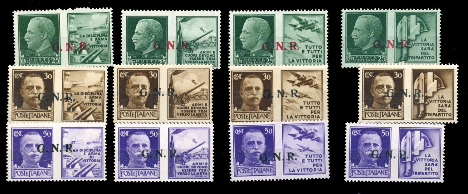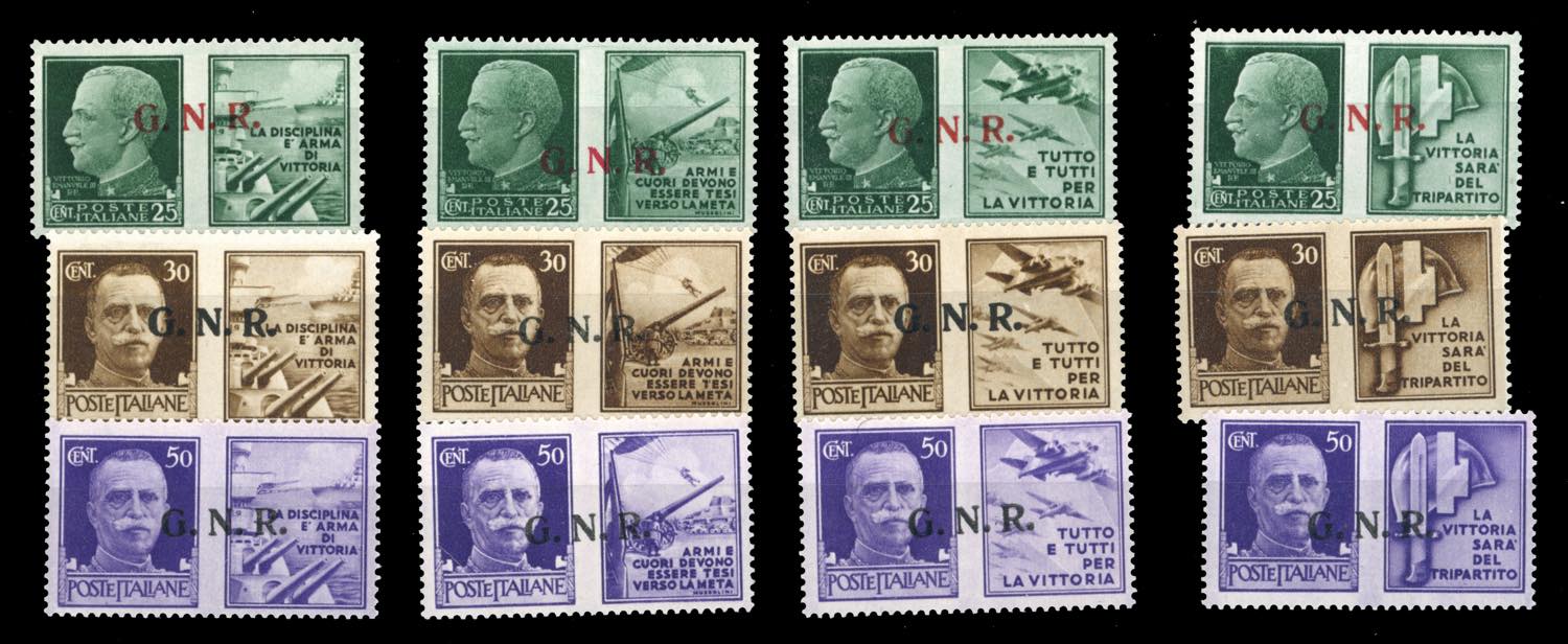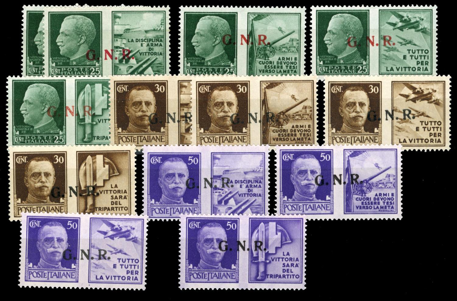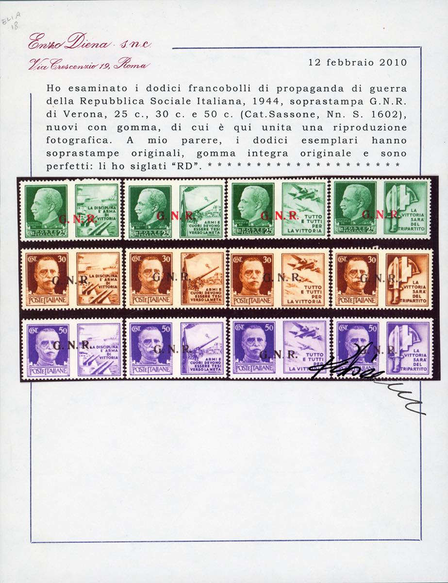 REPUBBLICA SOCIALE ITALIANA 1943/1944 - Quattro serie di Propaganda di guerra, soprastampate G.N.R. tiratura di Brescia, gomma integra, inoltre una serie Fascetto tiratura di Roma e due esemplari di Firenze. Tutto il materiale corredato dai relativi certificati.