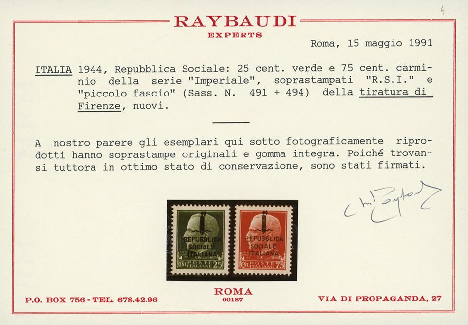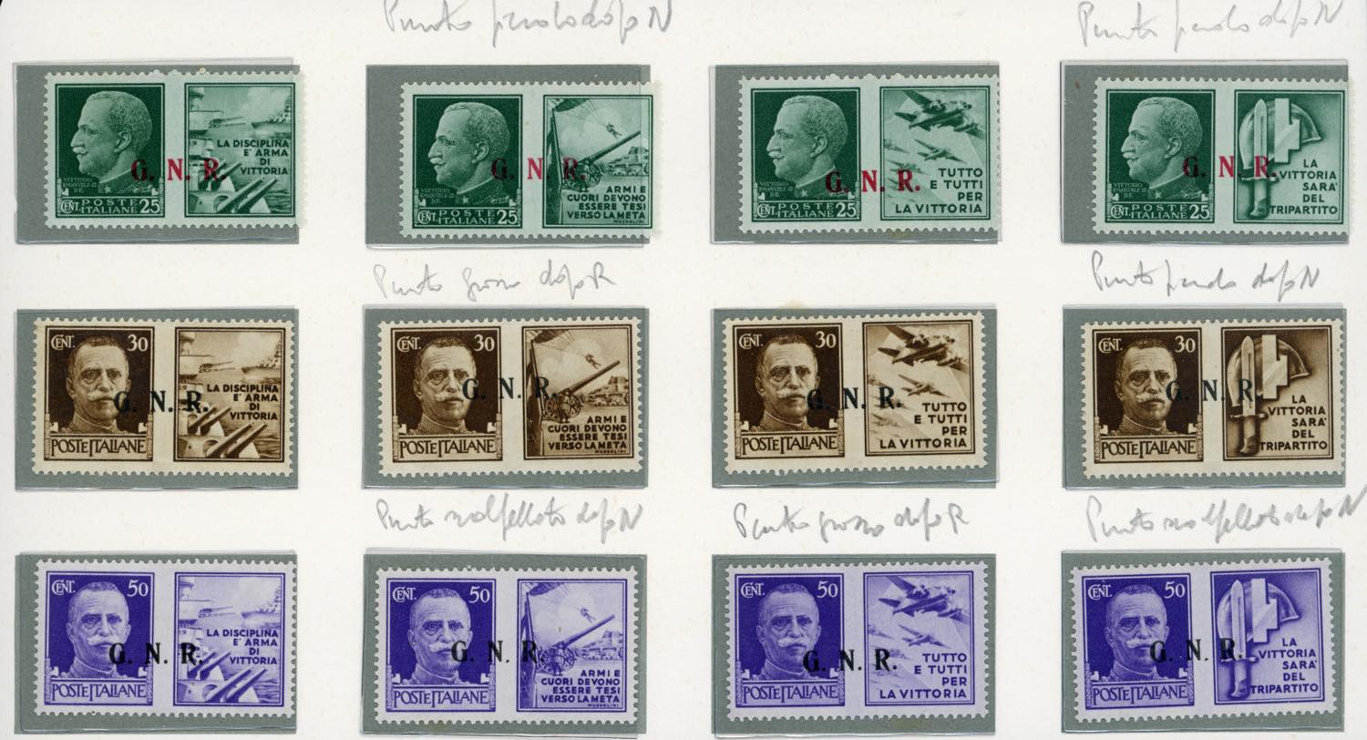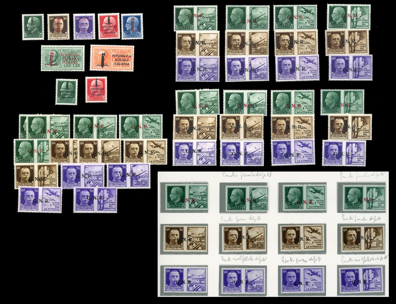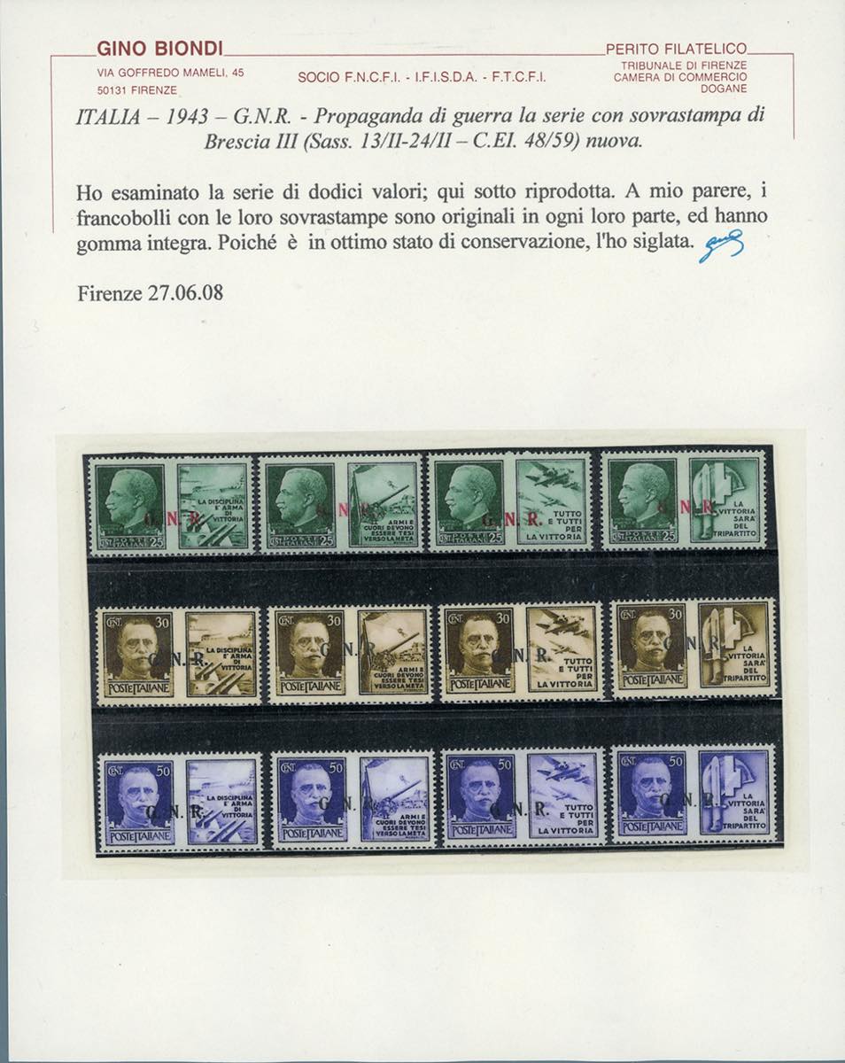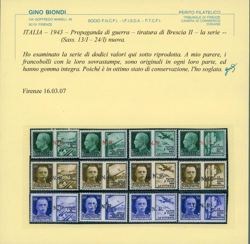 REPUBBLICA SOCIALE ITALIANA 1943/1944 - Quattro serie di Propaganda di guerra, soprastampate G.N.R. tiratura di Brescia, gomma integra, inoltre una serie Fascetto tiratura di Roma e due esemplari di Firenze. Tutto il materiale corredato dai relativi certificati.