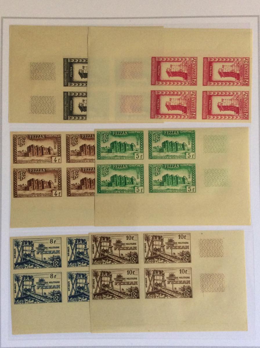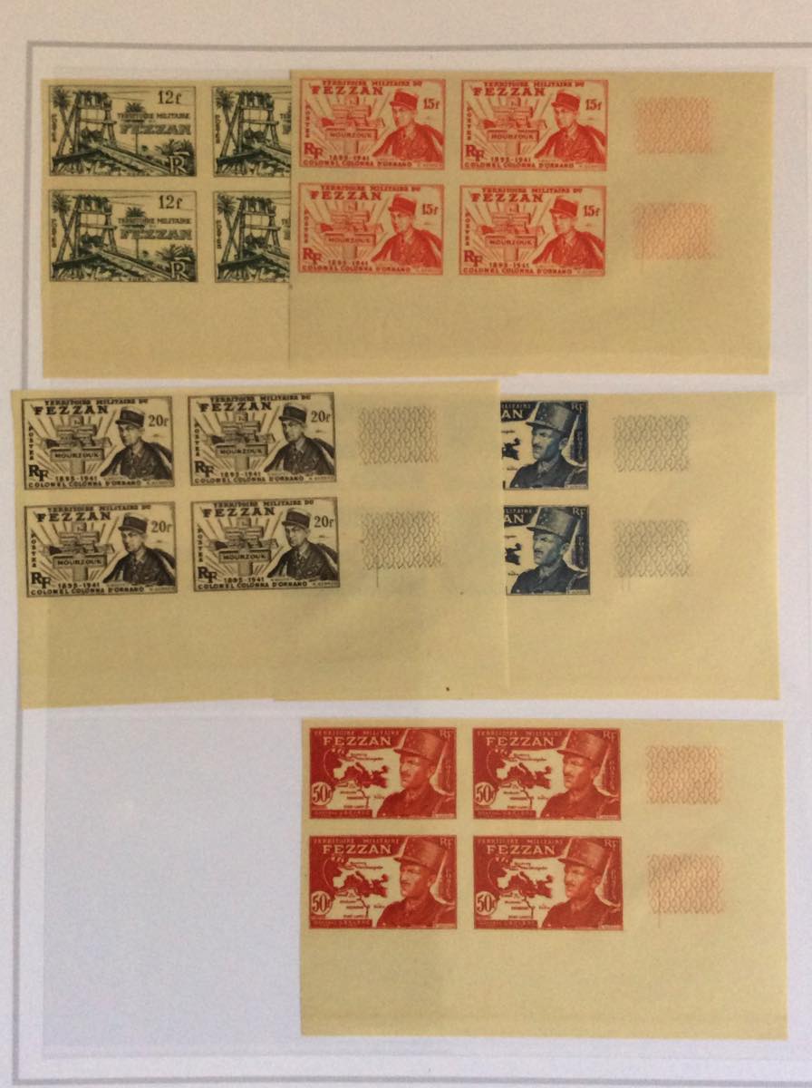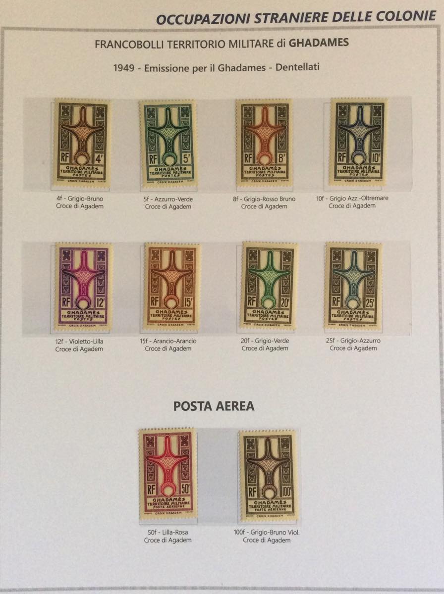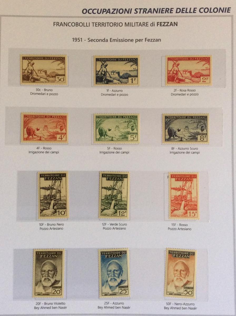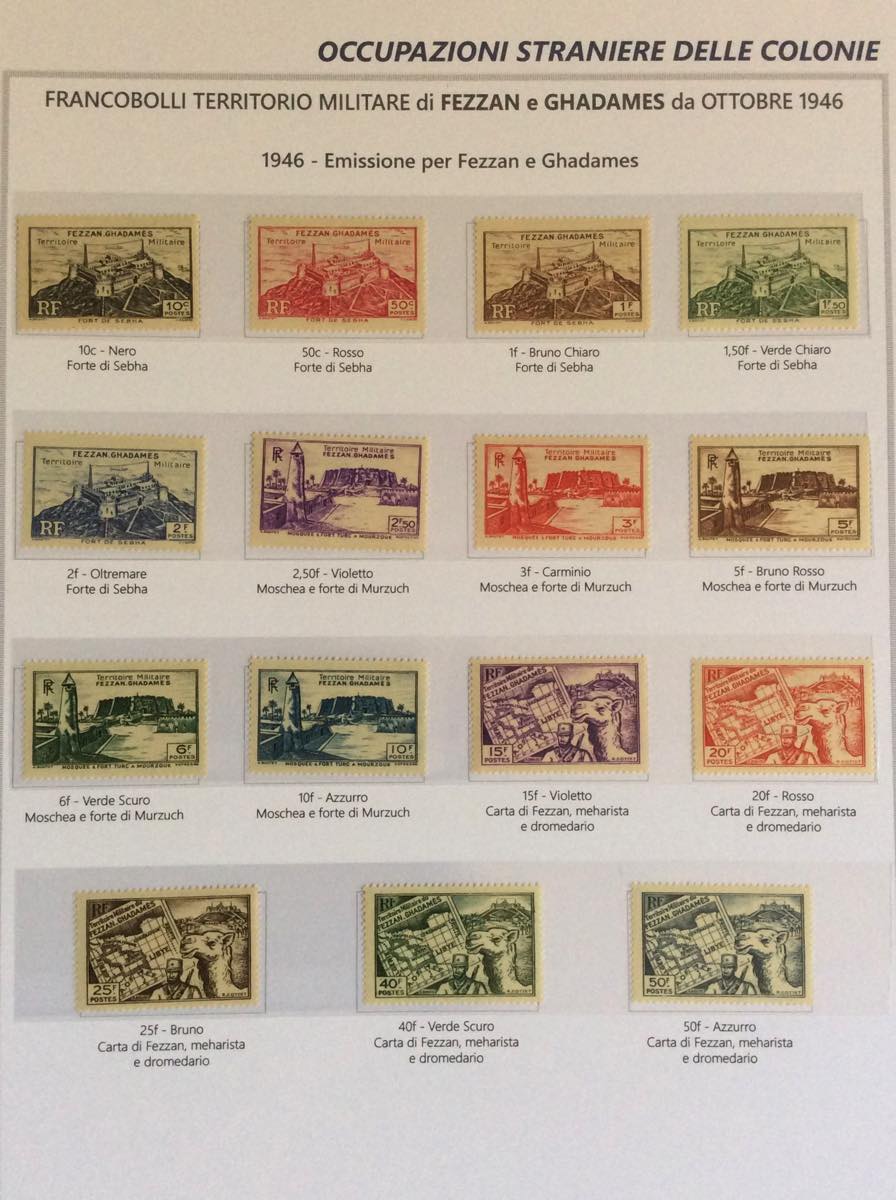 OCCUPAZIONE BRITANNICA FRANCESE EX COLONIE ITALIANE 1942/1951 - Bell'insieme di francobolli nuovi del periodo in un album Marini. Notate diverse interessanti e non comuni presenze di Fezzan e Ghadames. Alto valore di catalogo, qualità generalmente ottima.