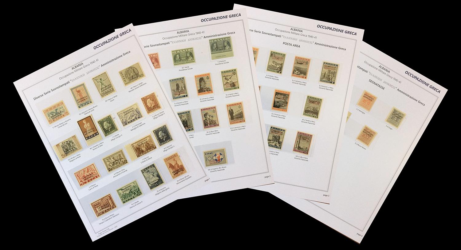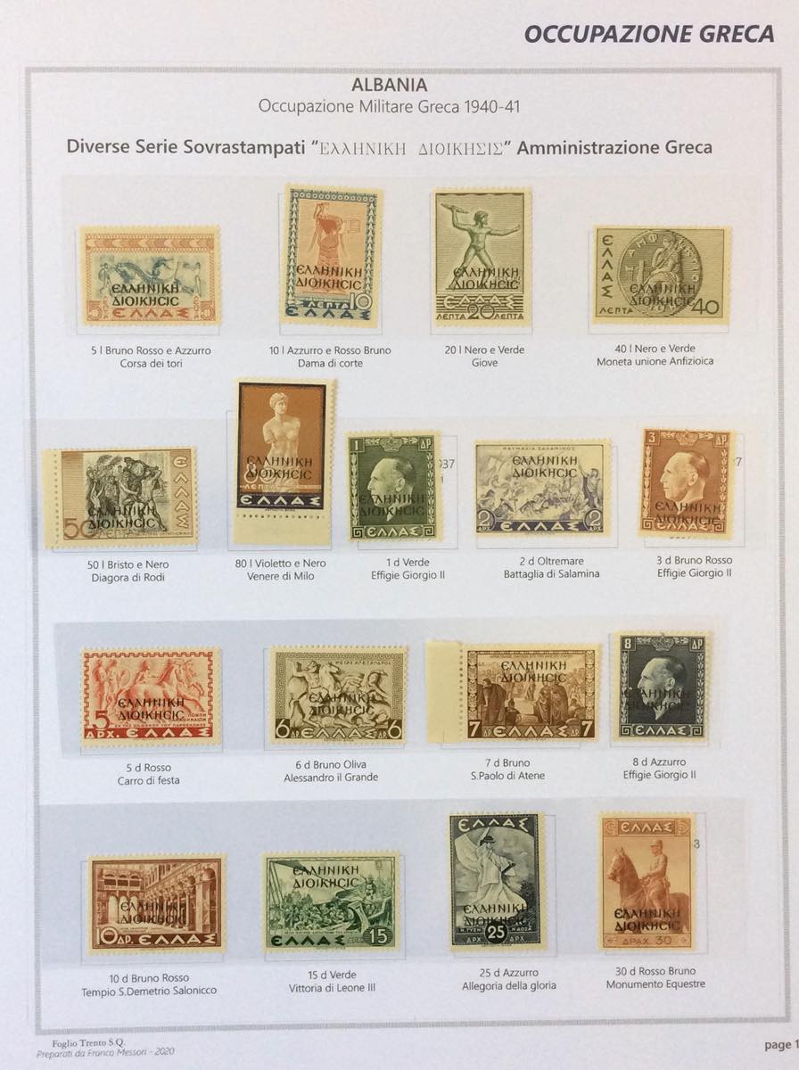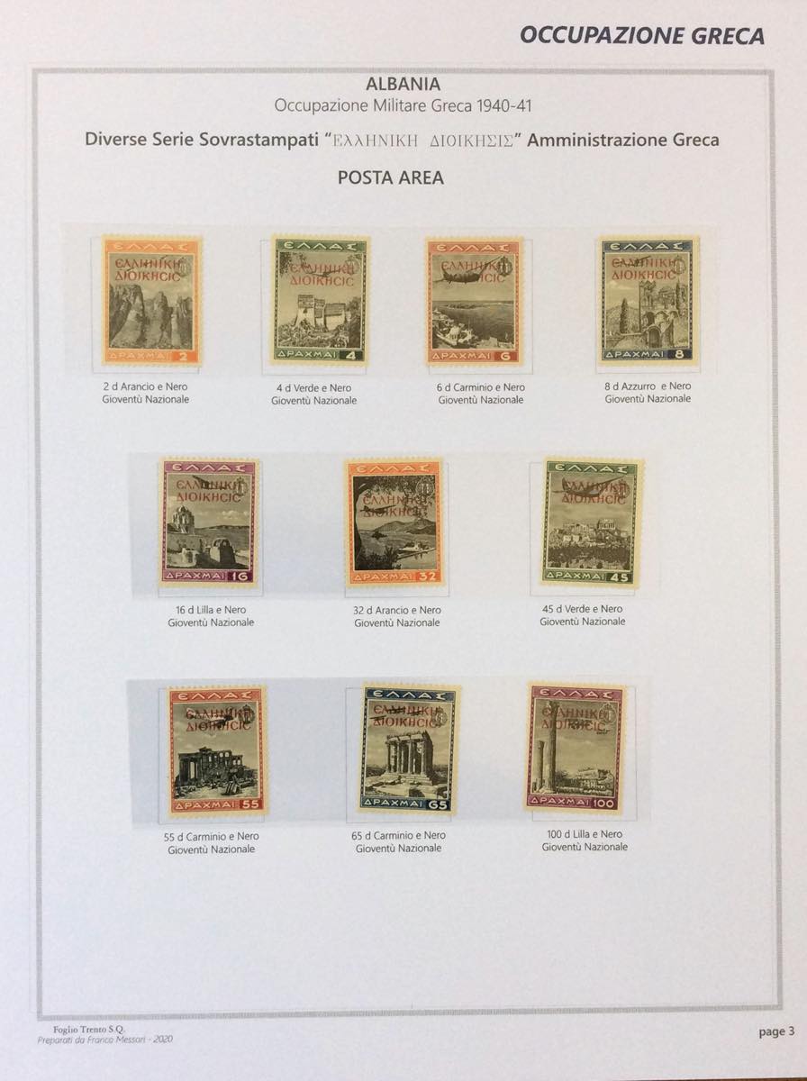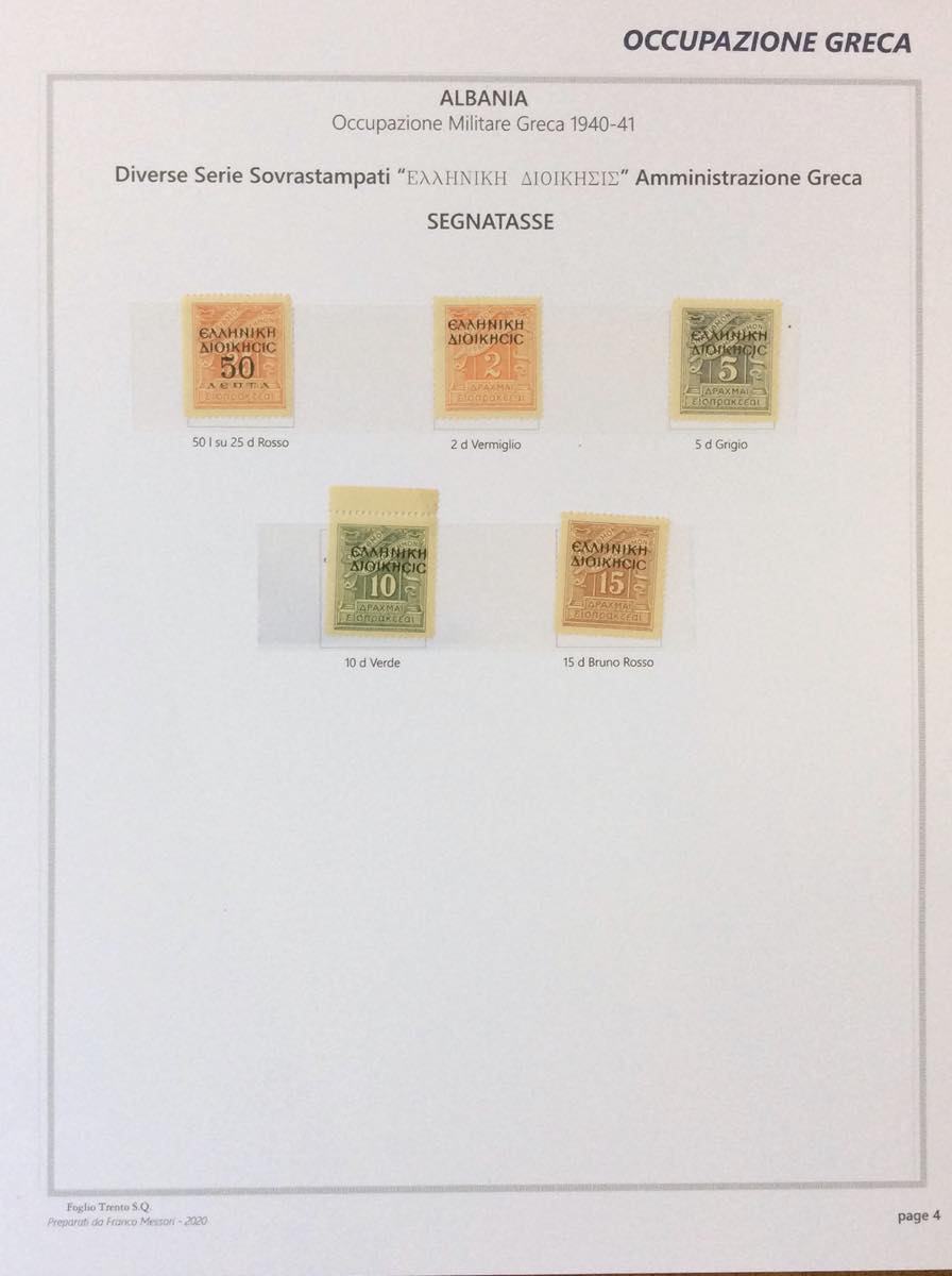 OCCUPAZIONE GRECA ALBANIA 1940/1941 - L'emissione completa di francobolli nuovi, gomma integra, ottima qualità, in fogli d'album autoprodotti (1/17,18/20,21/30+A,Tax 1/5).