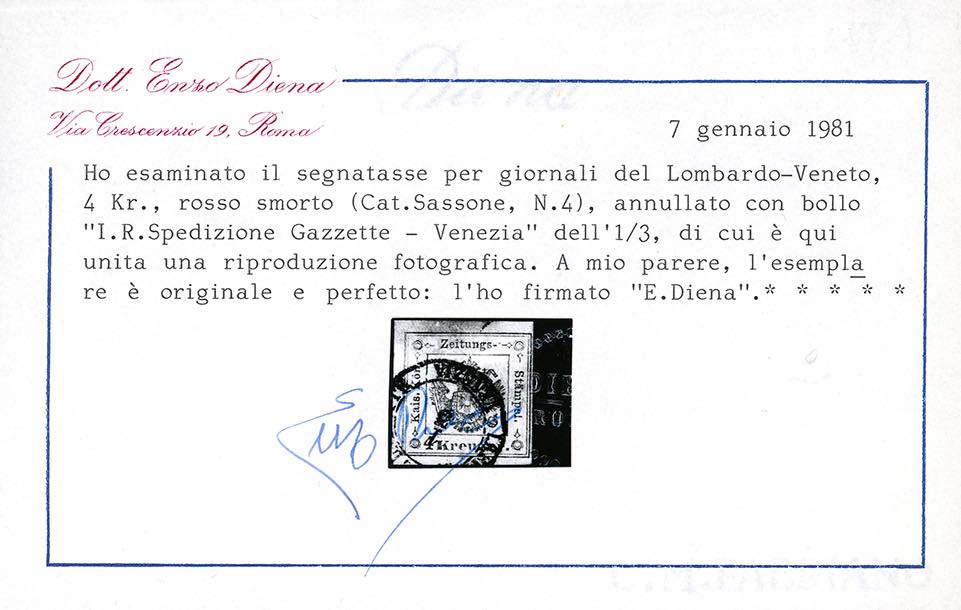 1858 - 4 kr. rosso smorto (4), perfetto e ben marginato, usato a Venezia 1/3. Bello e raro. Emilio e Alberto Diena, cert. E.Diena.
