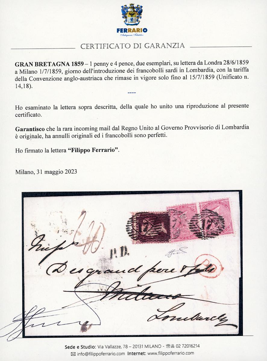 1859-INCOMING MAIL GRAN BRETAGNA - 1 penny, 4 pence, due esemplari Regina Vittoria (Unif.14,18), perfetti, su lettera da Londra 28/6/1859 a Milano 1/7/1859, giorno dell'introduzione dei francoblli sardi in Lombardia. Rara incoming mail dal Regno Unito al Governo Provvisorio di Lombardia, con la tariffa della Convenzione anglo-austriaca che rimase in vigore solo fino al 15/7/1859. Dettagliata relazione storico postale. Cert. Ferrario.