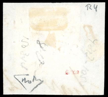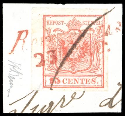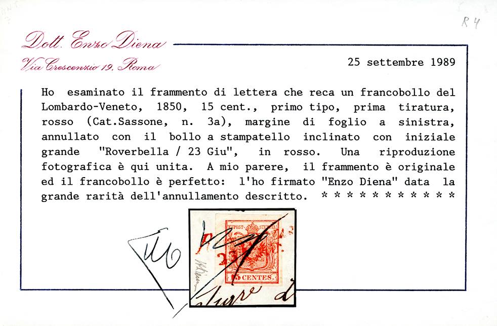 ROVERBELLA, SI Ig. rosso, punti R4 - 15 cent. rosso, I tiratura (3a), bordo di foglio a sinistra, usato su piccolo frammento il 23/6/1850, primo mese d'uso, con tratto a penna coannullatore. Annullo in rosso estremamente raro, non catalogato congiuntamente all'annullo a penna. A.Diena, cert. E.Diena.