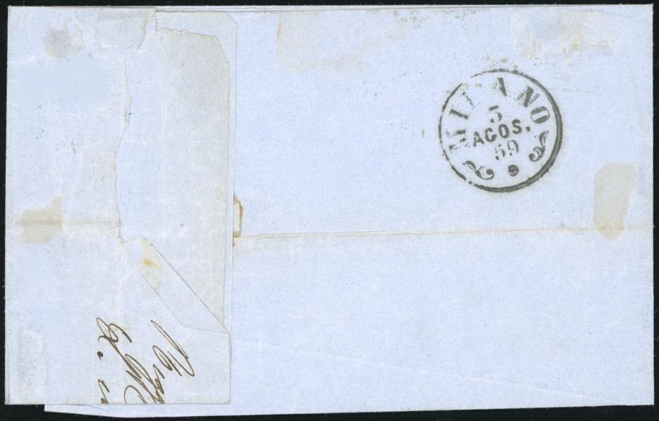1859 - 5 cent. verde, punto dopo le cifre, 15 cent. giallo, senza punto dopo le cifre (7,3), perfetti, su sovracoperta di lettera da Reggio 2/8/1859 a Milano. Splendida e rara lettera del Cisappennino in periodo di Governo Provvisorio. Cert. E.Diena.