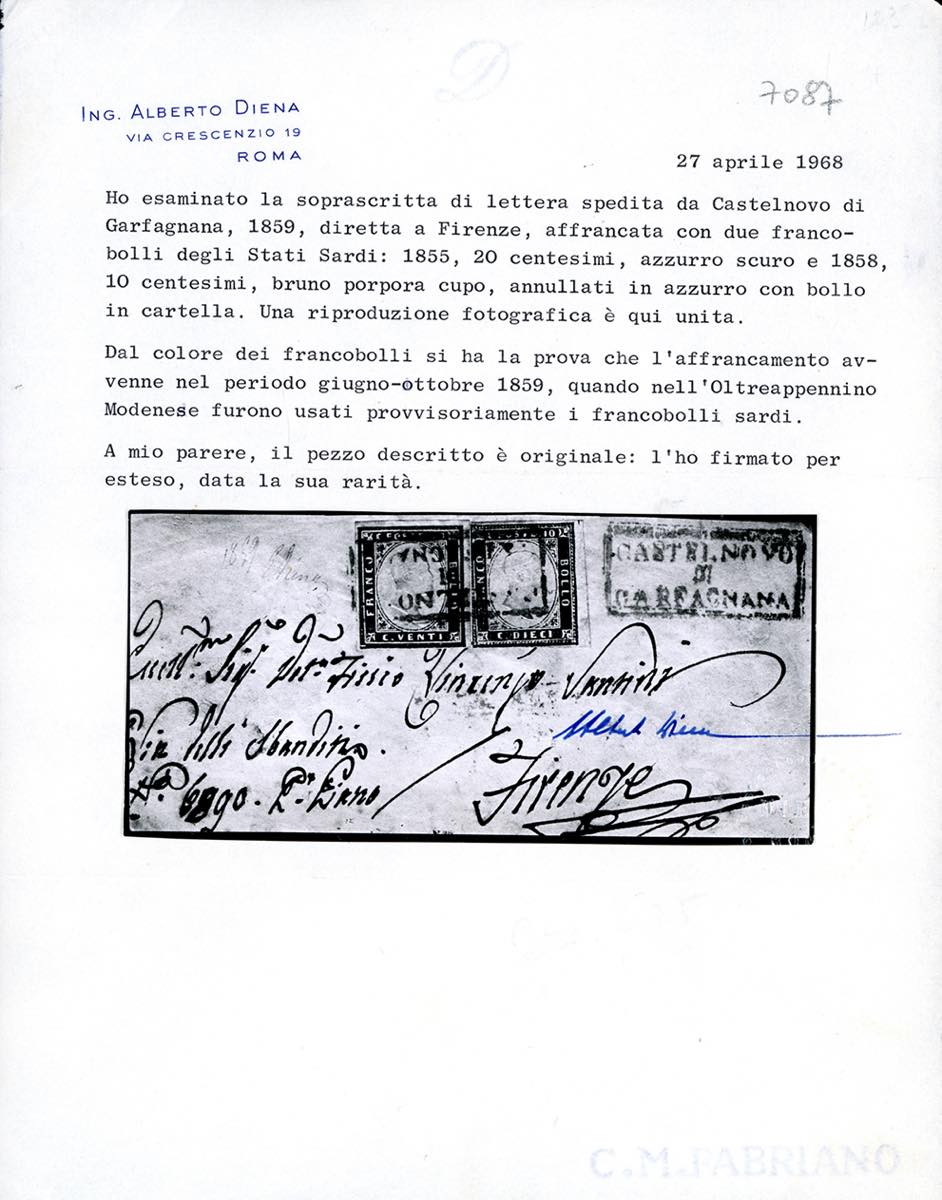 1859 - 10 cent. bruno porpora, 20 cent. azzurro scuro, IV emissione di Sardegna (14Ac,15B), ottimo stato, su frontespizio di lettera da Castelnuovo di Garfagnana a Firenze. Rarissimo uso provvisorio dei francobolli di Sardegna nell'Oltreappennino Modenese tra il giugno e l'ottobre 1859, in periodo di Governo Provvisorio. Insieme unico! Em.Diena, cert. A. ed E.Diena, Colla. Ex coll. Gerli.