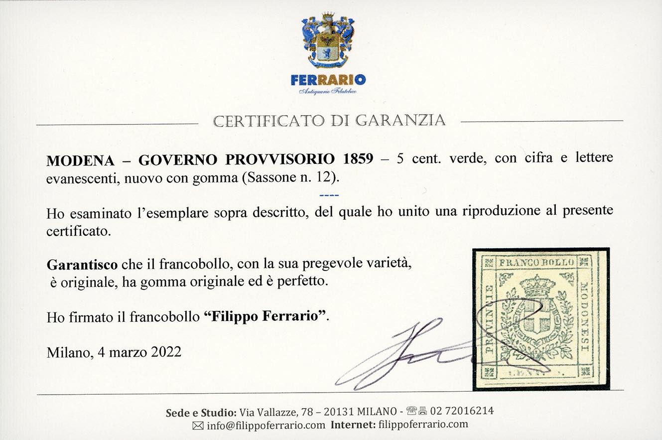 1859 - 5 cent. verde, CIFRA E LETTERE EVANESCENTI (12), nuovo, gomma originale, lieve traccia di linguella, perfetto. Bella e non comune varietà non catalogata. Cert. Ferrario.