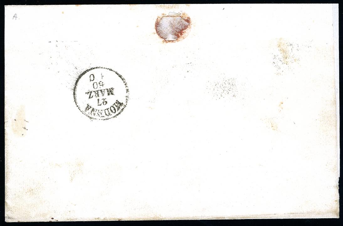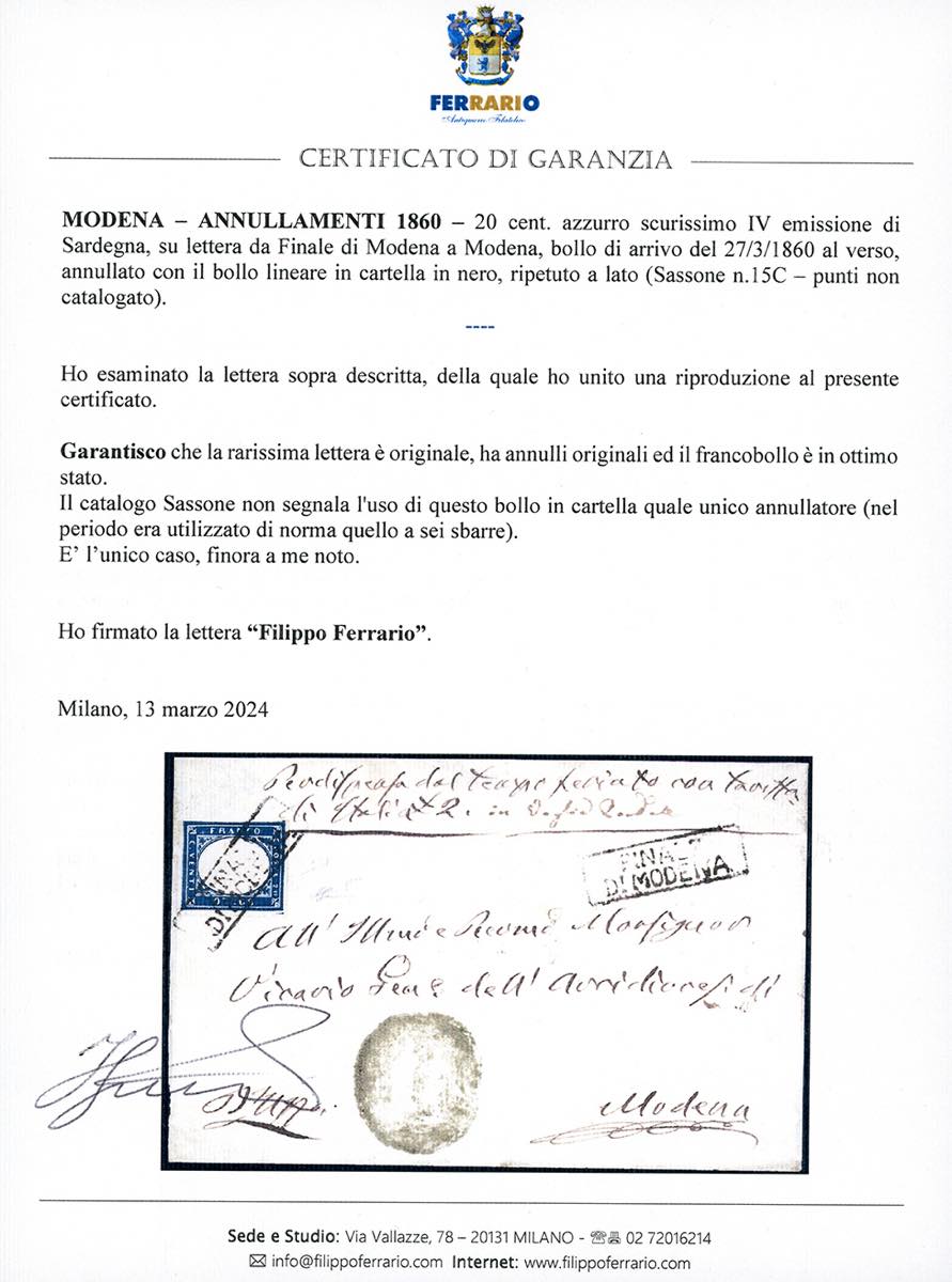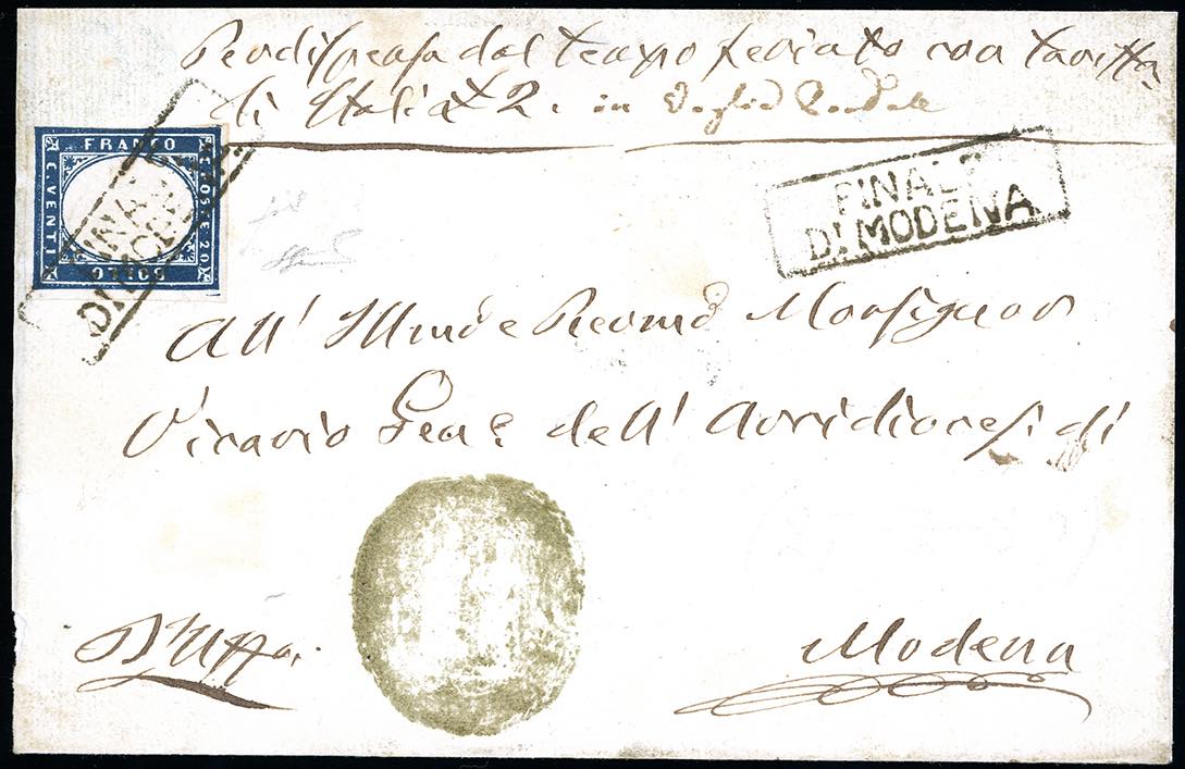 FINALE DI MODENA, cartella in nero, non catalogato - 20 cent. IV emissione di Sardegna (15C), giusto a sinistra, su lettera senza i lembi laterali per Modena, bollo di arrivo del 27/3/1860, sul fronte vi è l'annotazione che la missiva conteneva una veglia postale di 2 lire. Il cat. Sassone non segnala l'uso di questo bollo in cartella quale unico annullatore (nel periodo era utilizzato di norma quello a sei sbarre). INSIEME INEDITO E PROBABILMENTE UNICO. Fiecchi, cert. Ferrario.