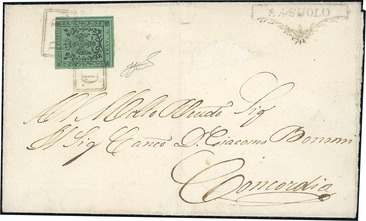 SASSUOLO, P.D. punti 11 - 5 cent. verde, II emissione (7), perfetto, su lettera da Sassuolo 23/12/1858 a Concordia. Raro annullo. Cert. Ferrario.