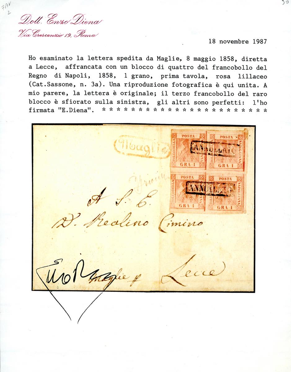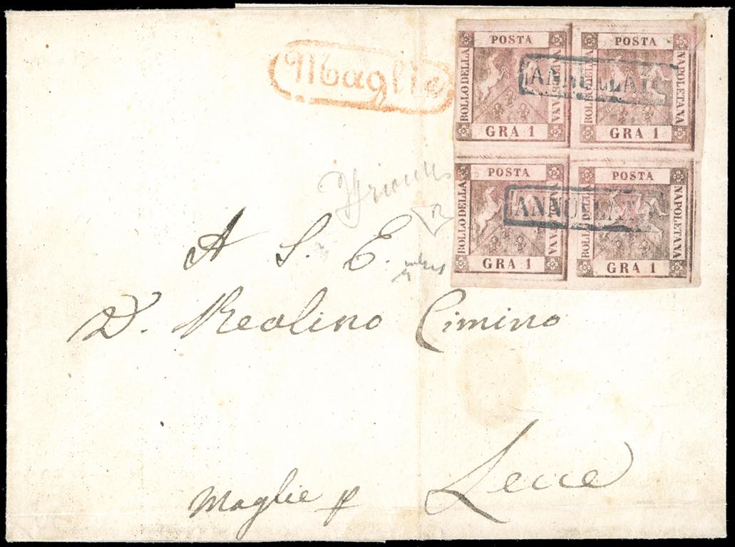 1858 - 1 grano rosa lillaceo, I tavola (3a), blocco di quattro, tre esemplari perfetti, uno sfiorato a sinistra, su fresca lettera da Maglie 8/5/1858 a Lecce. Molto rara e di ottimo aspetto. Grioni, Chiavarello, cert. E.Diena. Ex coll. Imperato.
