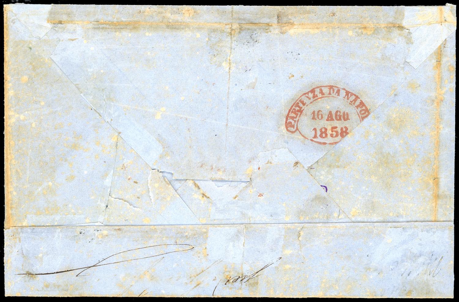 1858 - 50 grana rosa lillaceo, 10 grana rosa brunastro I tavola, 5 grana rosa lillaceo I tavola, 1 grano rosa chiaro I tavola (14a,10,8a,3), su busta da Napoli 16/8/1858 Messina. La missiva, in tariffa di un' oncia e mezzo, spedita con i vapori postali francesi, reca il bollo "Servizio dei vapori francesi nel Mediterraneo-Posta di Napoli" che colpisce i francobolli da 10 e 50 grana. Insieme molto raro. Russo, Colla, Ferrario, cert. Raybaudi ed Enzo Diena.