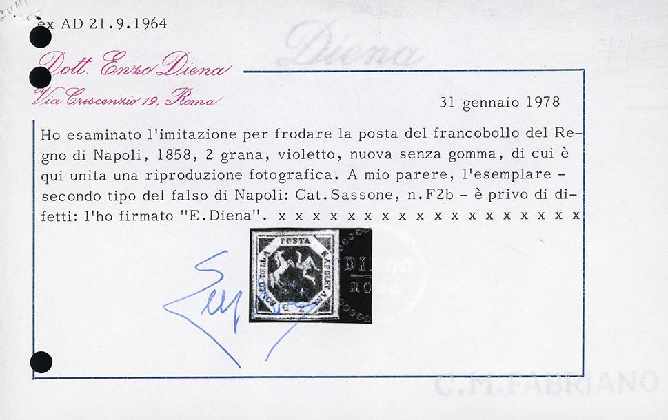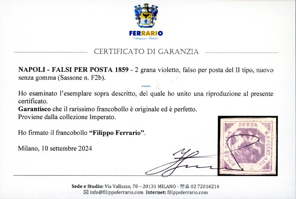 1859 - 2 grana violetto, falso per posta, II tipo (F2b), nuovo senza gomma, perfetto e di ottima qualità. Molto raro, pochissimi esemplari esistenti nuovi. Alberto Diena, cert. Enzo Diena e ex coll. Imperato.