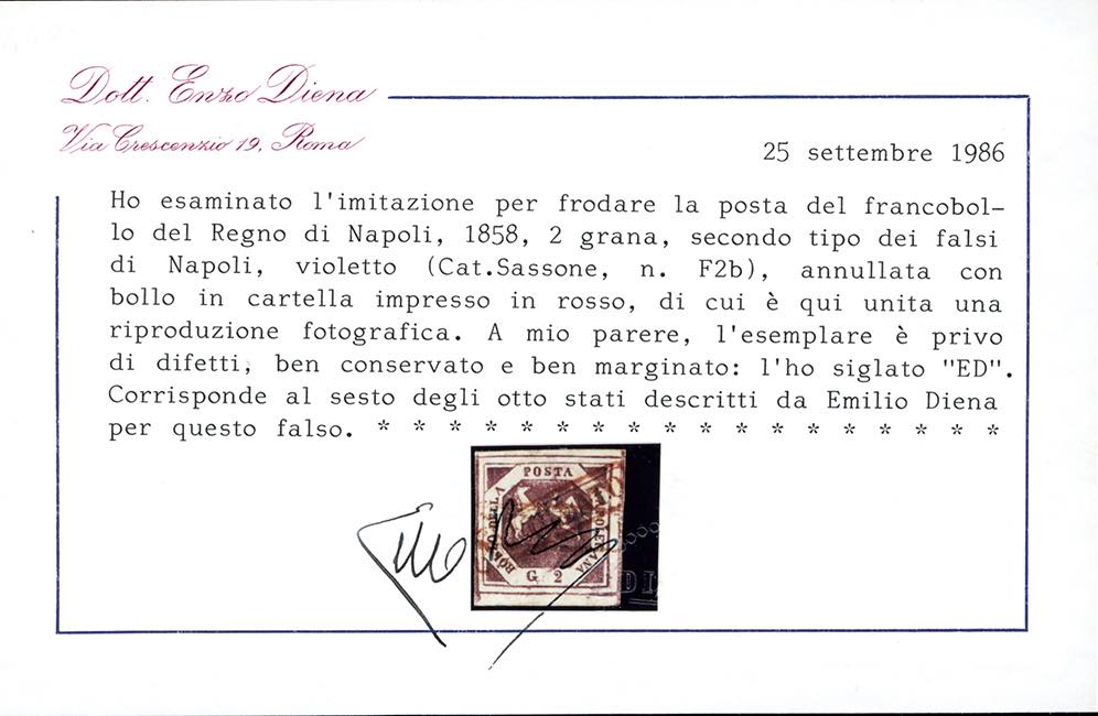 1858 - 2 grana violetto, falso per posta (F2b), perfetto e ben marginato, usato con il bollo "annullato" in cartella impresso in inchiostro rosso. Splendido e probabilmente UNICO FALSO NOTO ANNULLATO IN ROSSO. Cert. Enzo Diena. Ex coll. Imperato.