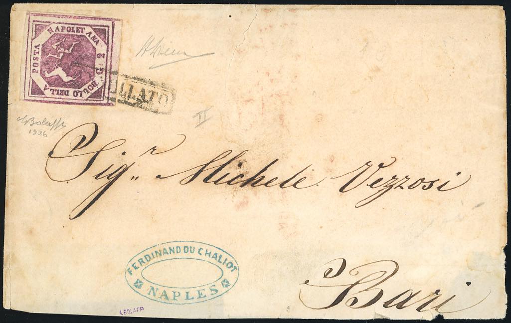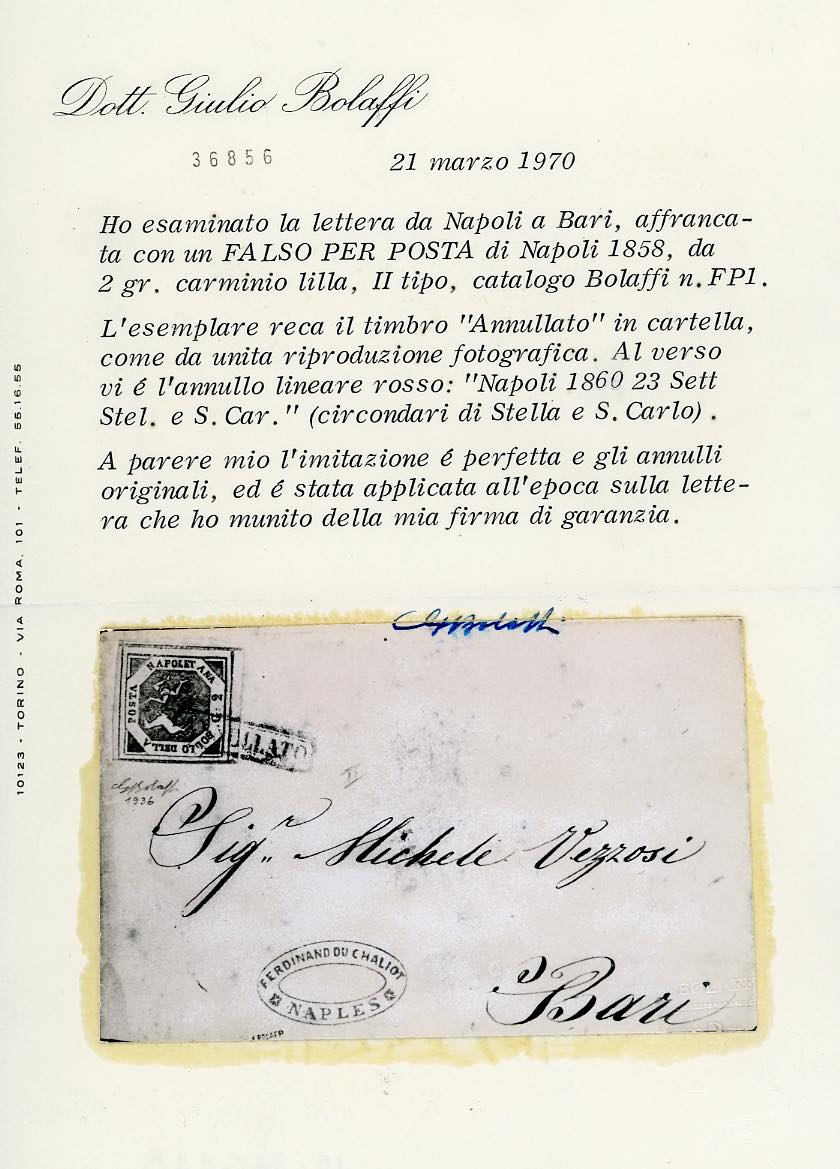 1860 - 2 grana violetto, falso per posta del II tipo (F2b), perfetto, su sovracoperta di lettera da Napoli 23/9/1860 a Bari. A.Diena, cert. G.Bolaffi.