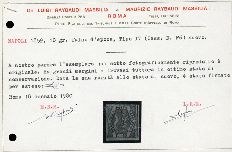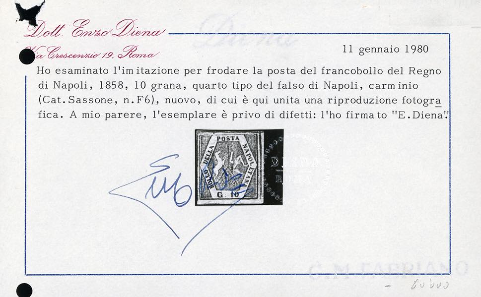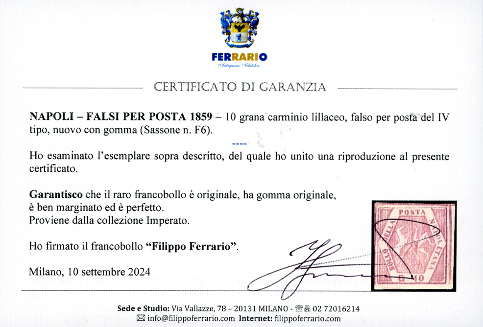 1859 - 10 grana carminio lillaceo, falso per posta, IV tipo (F6), gomma originale, perfetto e ben marginato. Splendido e di ottima qualità. Raro, pochi esistenti nuovi. Cert. Enzo Diena, Raybaudi e Ferrario. Ex coll. Imperato.