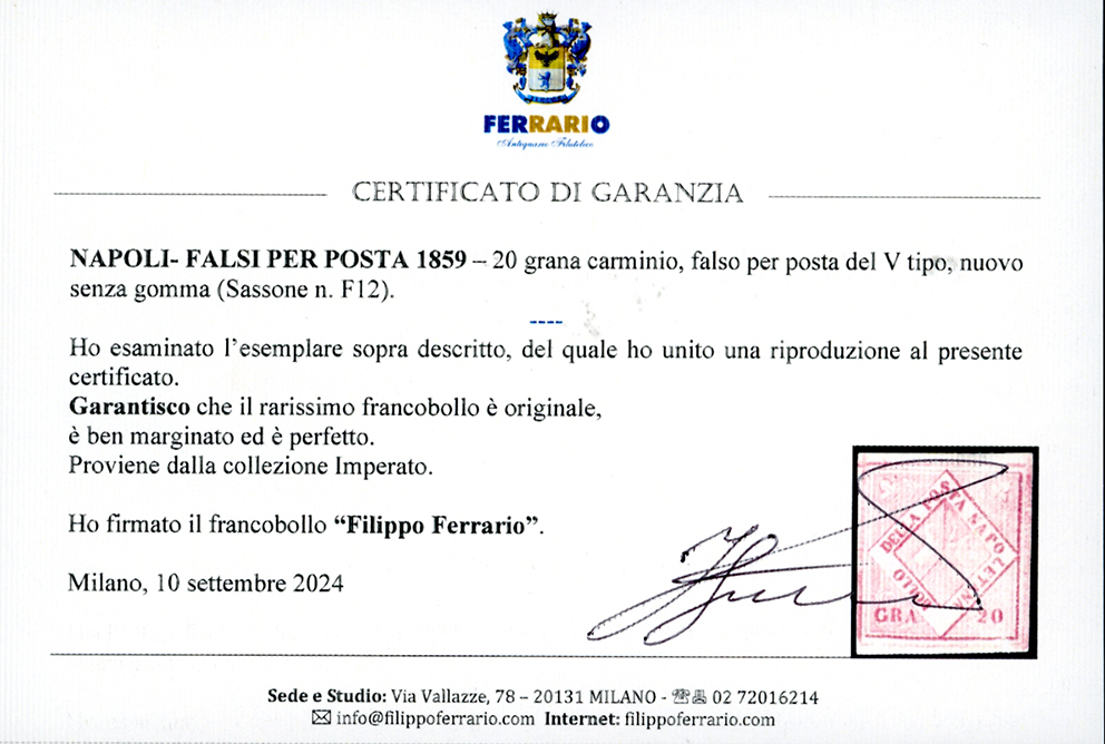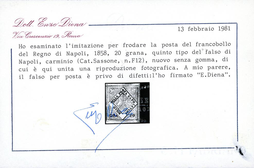 1860 - 20 grana carminio, falso per posta, V tipo (F12), nuovo senza gomma, ben marginato, perfetto. Molto raro e di splendido aspetto. Cert. Enzo Diena e Ferrario. Ex coll. Imperato.